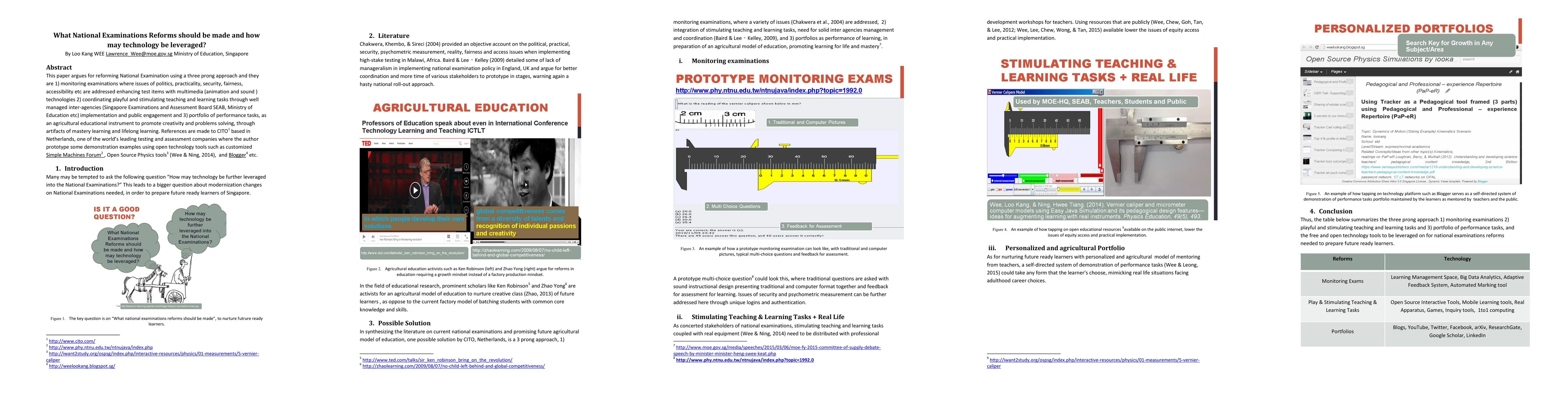 This paper argues for reforming National Examination using a three prong approach and they are 1) monitoring examinations where issues of politics, practicality, security, fairness, accessibility etc. are addressed while enhancing test items with multimedia (animation and sound ) technologies 2) coordinating playful and stimulating teaching and learning tasks through well managed inter-agencies (Singapore Examinations and Assessment Board SEAB, Ministry of Education etc.) implementation and public engagement and 3) portfolio of performance tasks, as an agricultural educational instrument to promote creativity and problems solving, through artifacts of mastery learning and lifelong learning. References are made to http://www.cito.com/ based in Netherlands, one of the world leading testing and assessment companies where the author prototype some demonstration examples using open technology tools such as customized Simple Machines LLC Forum , Open Source Physics tools (Wee and Ning, 2014), and Blogger etc