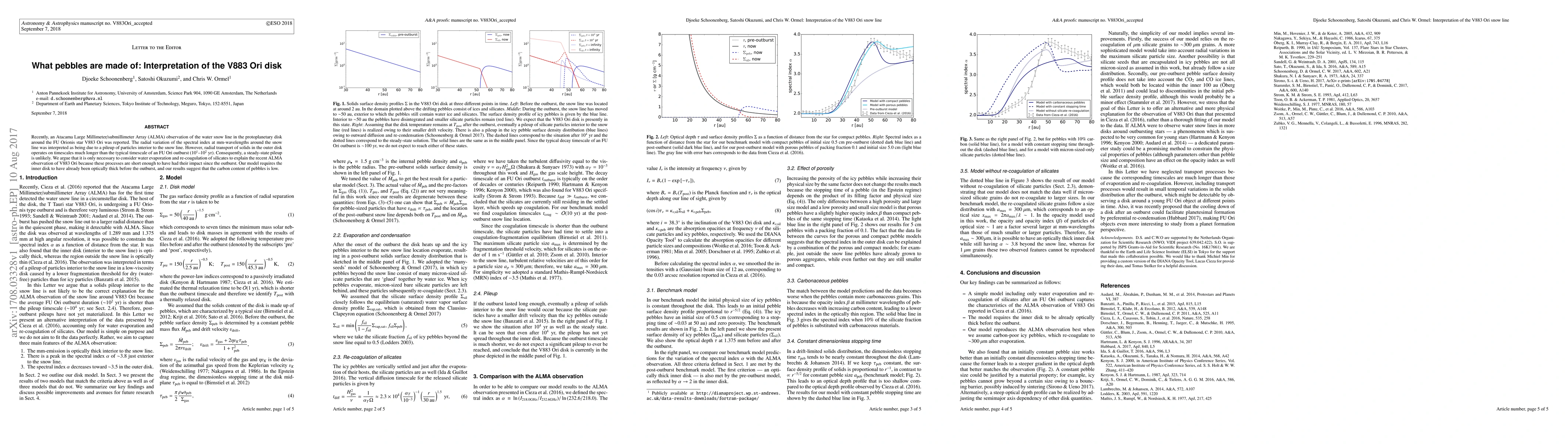 This paper argues that the spectral index variation observed in the V883 Ori protoplanetary disk near the water snow line can be explained by water evaporation and silicate re-coagulation, rather than a steady-state pileup of particles, due to their shorter timescales. The model suggests low carbon content in the pebbles and an optically thick inner disk prior to the outburst.