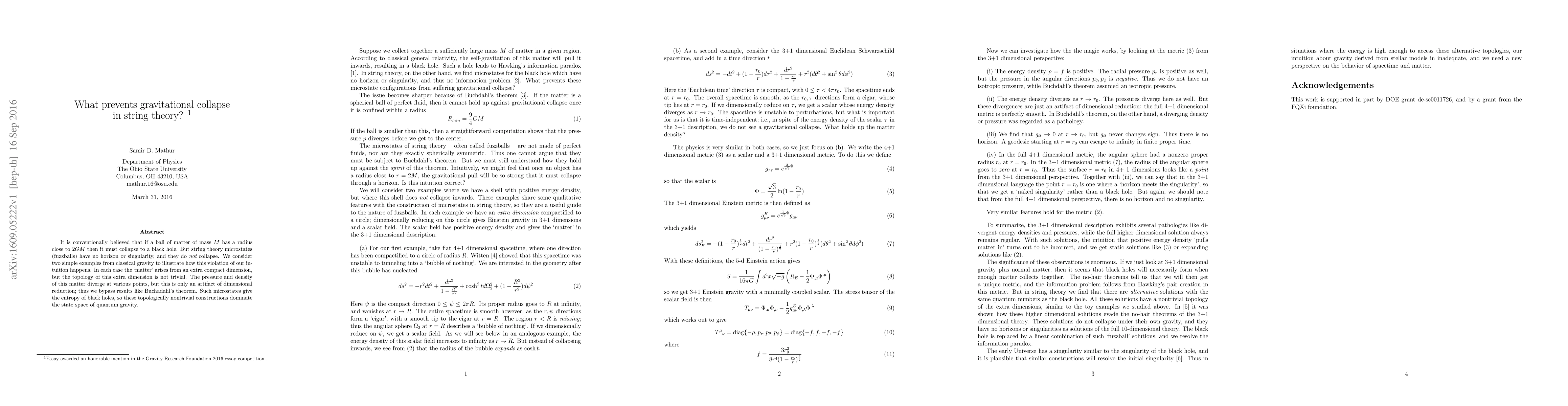 This paper explores how string theory's fuzzballs prevent gravitational collapse by avoiding horizons and singularities, using examples from classical gravity where extra compact dimensions with nontrivial topology lead to diverging pressure and density, thus bypassing conventional collapse theorems. These topologically complex microstates dominate the quantum gravity state space and determine black hole entropy.