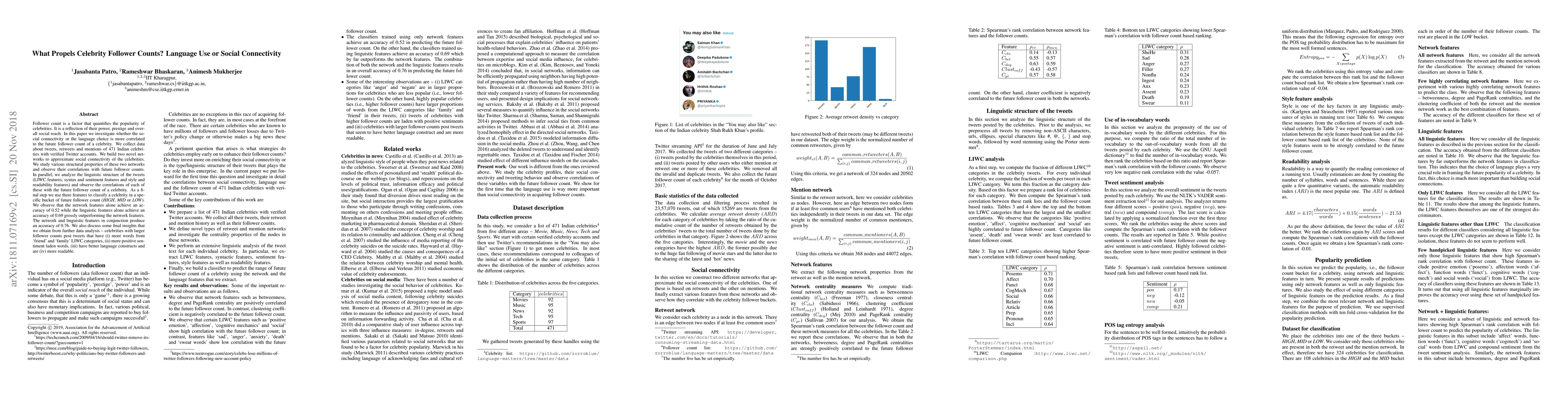 Follower count is a factor that quantifies the popularity of celebrities. It is a reflection of their power, prestige and overall social reach. In this paper we investigate whether the social connectivity or the language choice is more correlated to the future follower count of a celebrity. We collect data about tweets, retweets and mentions of 471 Indian celebrities with verified Twitter accounts. We build two novel networks to approximate social connectivity of the celebrities. We study various structural properties of these two networks and observe their correlations with future follower counts. In parallel, we analyze the linguistic structure of the tweets (LIWC features, syntax and sentiment features and style and readability features) and observe the correlations of each of these with the future follower count of a celebrity. As a final step we use there features to classify a celebrity in a specific bucket of future follower count (HIGH, MID or LOW). We observe that the network features alone achieve an accuracy of 0.52 while the linguistic features alone achieve an accuracy of 0.69 grossly outperforming the network features. The network and linguistic features in conjunction produce an accuracy of 0.76. We also discuss some final insights that we obtain from further data analysis celebrities with larger follower counts post tweets that have (i) more words from friend and family LIWC categories, (ii) more positive sentiment laden words, (iii) have better language constructs and are (iv) more readable.
