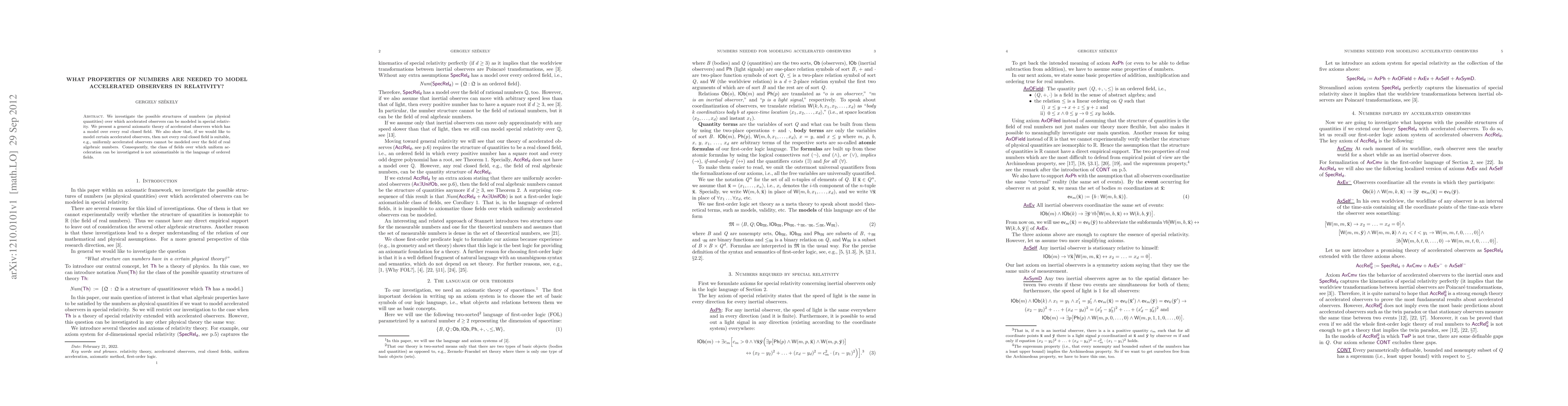 This paper explores the mathematical structures of numbers required to model accelerated observers in special relativity, presenting a general axiomatic theory applicable to real closed fields. It concludes that certain accelerated observers, like uniformly accelerated ones, cannot be modeled over fields like real algebraic numbers, indicating limitations in axiomatizability for uniform acceleration.