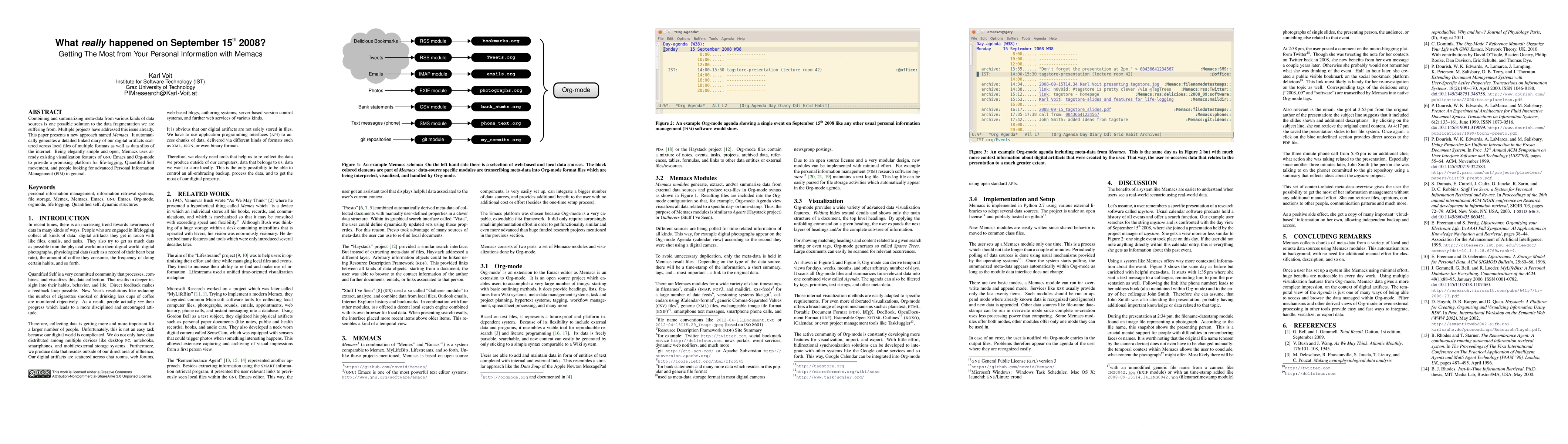 Combining and summarizing meta-data from various kinds of data sources is one possible solution to the data fragmentation we are suffering from. Multiple projects have addressed this issue already. This paper presents a new approach named Memacs. It automatically generates a detailed linked diary of our digital artifacts scattered across local files of multiple formats as well as data silos of the internet. Being elegantly simple and open, Memacs uses already existing visualization features of GNU Emacs and Org-mode to provide a promising platform for life-logging, Quantified Self movement, and people looking for advanced Personal Information Management (PIM) in general.