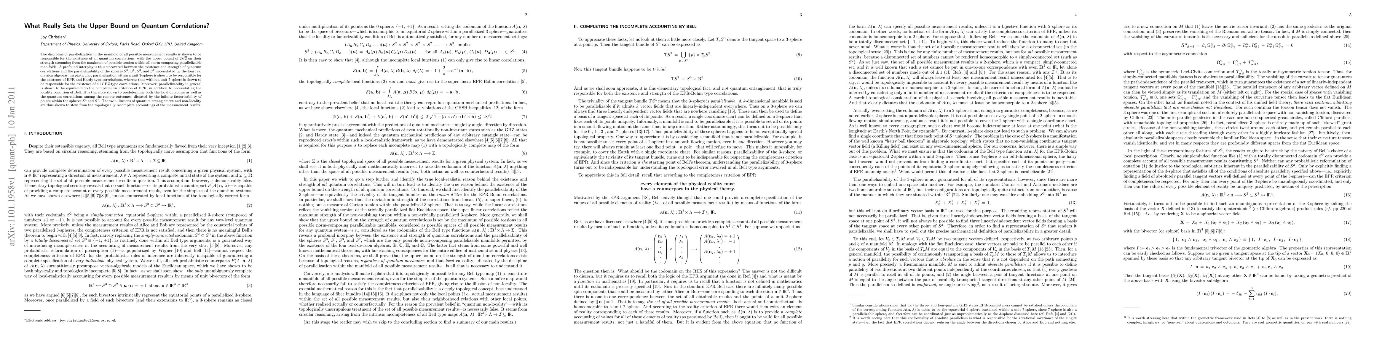 The discipline of parallelization in the manifold of all possible measurement results is shown to be responsible for the existence of all quantum correlations, with the upper bound on their strength stemming from the maximum of possible torsion within all norm-composing parallelizable manifolds. A profound interplay is thus uncovered between the existence and strength of quantum correlations and the parallelizability of the spheres S^0, S^1, S^3, and S^7 necessitated by the four real division algebras. In particular, parallelization within a unit 3-sphere is shown to be responsible for the existence of EPR and Hardy type correlations, whereas that within a unit 7-sphere is shown to be responsible for the existence of all GHZ type correlations. Moreover, parallelizability in general is shown to be equivalent to the completeness criterion of EPR, in addition to necessitating the locality condition of Bell. It is therefore shown to predetermine both the local outcomes as well as the quantum correlations among the remote outcomes, dictated by the infinite factorizability of points within the spheres S^3 and S^7. The twin illusions of quantum entanglement and non-locality are thus shown to stem from the topologically incomplete accountings of the measurement results.