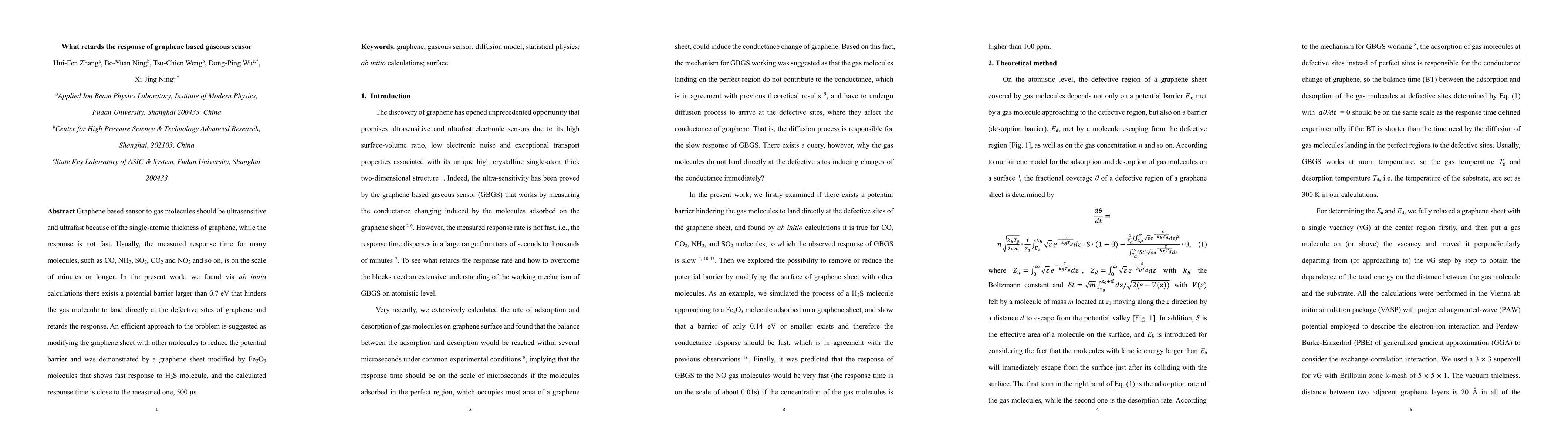 Graphene based sensor to gas molecules should be ultrasensitive and ultrafast because of the single-atomic thickness of graphene, while the response is not fast. Usually, the measured response time for many molecules, such as CO, NH3, SO2, CO2 and NO2 and so on, is on the scale of minutes or longer. In the present work, we found via \emph{ab initio} calculations there exists a potential barrier larger than 0.7 eV that hinders the gas molecule to land directly at the defective sites of graphene and retards the response. An efficient approach to the problem is suggested as modifying the graphene sheet with other molecules to reduce the potential barrier and was demonstrated by a graphene sheet modified by Fe2O3 molecules that shows fast response to H2S molecule, and the calculated response time is close to the measured one, 500 $\mu$s.