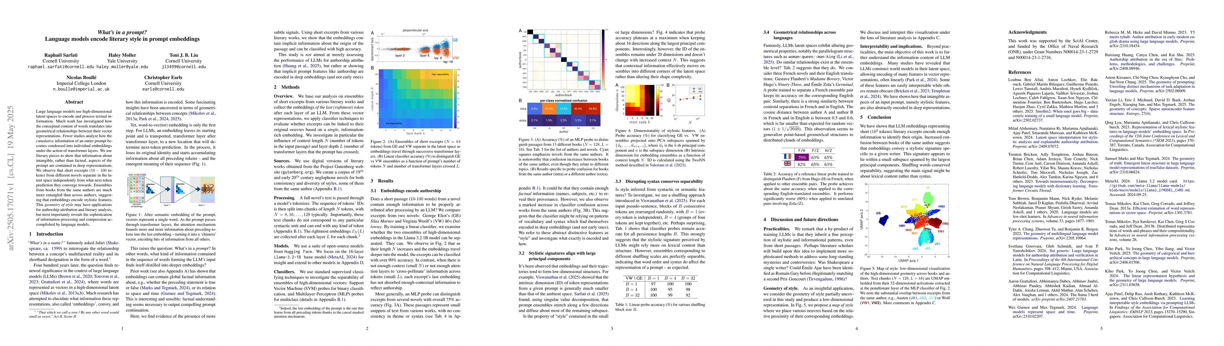 This research is important as it uncovers the encoding of literary style in prompt embeddings, which may have applications in authorship attribution and literary analysis, and demonstrates the advanced information processing capabilities of language models.