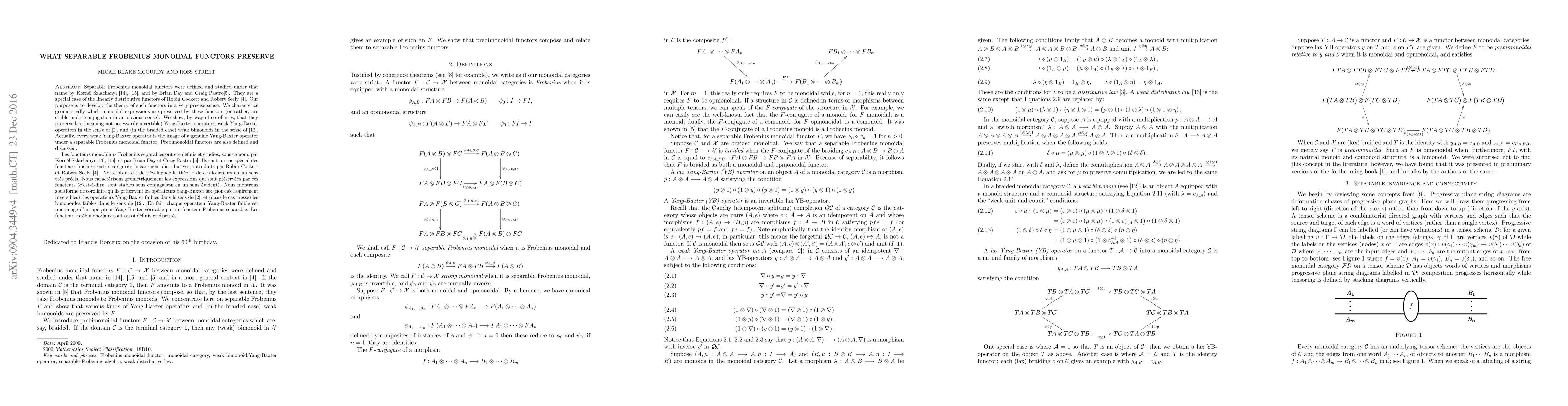 Separable Frobenius monoidal functors were defined and studied under that name by Szlachanyi and by Day and Pastro, and in a more general context by Cockett and Seely. Our purpose here is to develop their theory in a very precise sense. We determine what kinds of equations in monoidal categories they preserve. For example we show they preserve lax (meaning not necessarily invertible) Yang-Baxter operators, weak Yang-Baxter operators in the sense of Alonso Alvarez et al., and (in the braided case) weak bimonoids in the sense of Pastro and Street. In fact, we characterize which monoidal expressions are preserved (or rather, are stable under conjugation in a well-defined sense). We show that every weak Yang-Baxter operator is the image of a genuine Yang-Baxter operator under a separable Frobenius monoidal functor. Prebimonoidal functors are also defined and discussed.