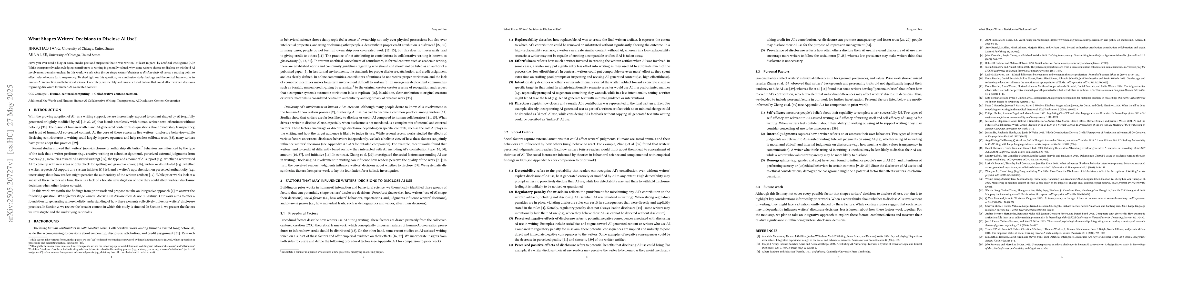 Have you ever read a blog or social media post and suspected that it was written--at least in part--by artificial intelligence (AI)? While transparently acknowledging contributors to writing is generally valued, why some writers choose to disclose or withhold AI involvement remains unclear. In this work, we ask what factors shape writers' decisions to disclose their AI use as a starting point to effectively advocate for transparency. To shed light on this question, we synthesize study findings and theoretical frameworks in human-AI interaction and behavioral science. Concretely, we identify and curate a list of factors that could affect writers' decisions regarding disclosure for human-AI co-created content.