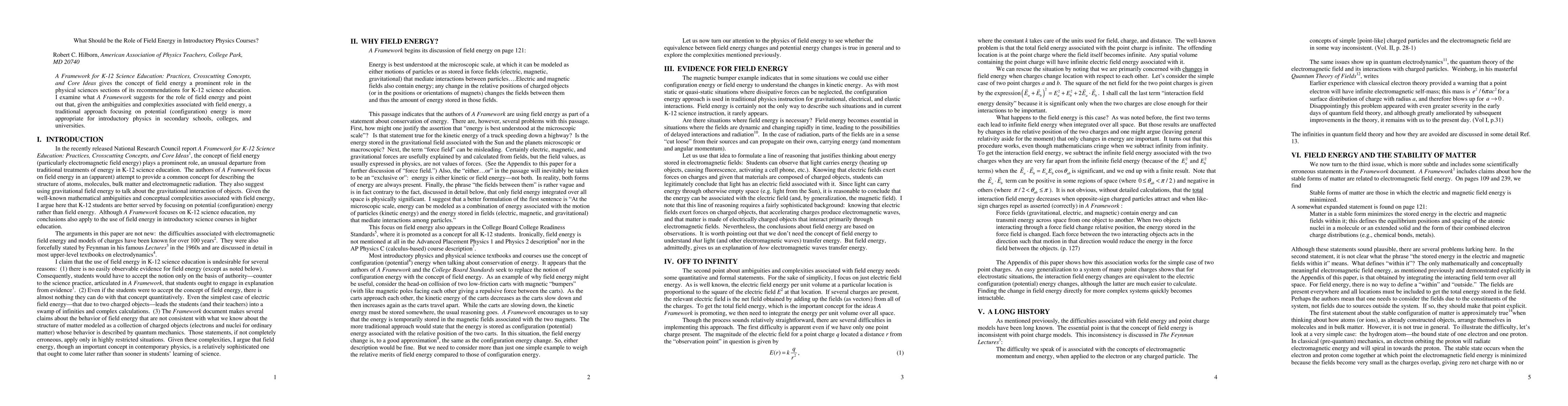 A Framework for K-12 Science Education: Practices, Crosscutting Concepts, and Core Ideas gives the concept of field energy a prominent role in the physical sciences sections of its recommendations for K-12 science education. I examine what A Framework suggests for the role of field energy and point out that, given the ambiguities and complexities associated with field energy, a traditional approach focusing on potential (configuration) energy is more appropriate for introductory physics in secondary schools, colleges, and universities.