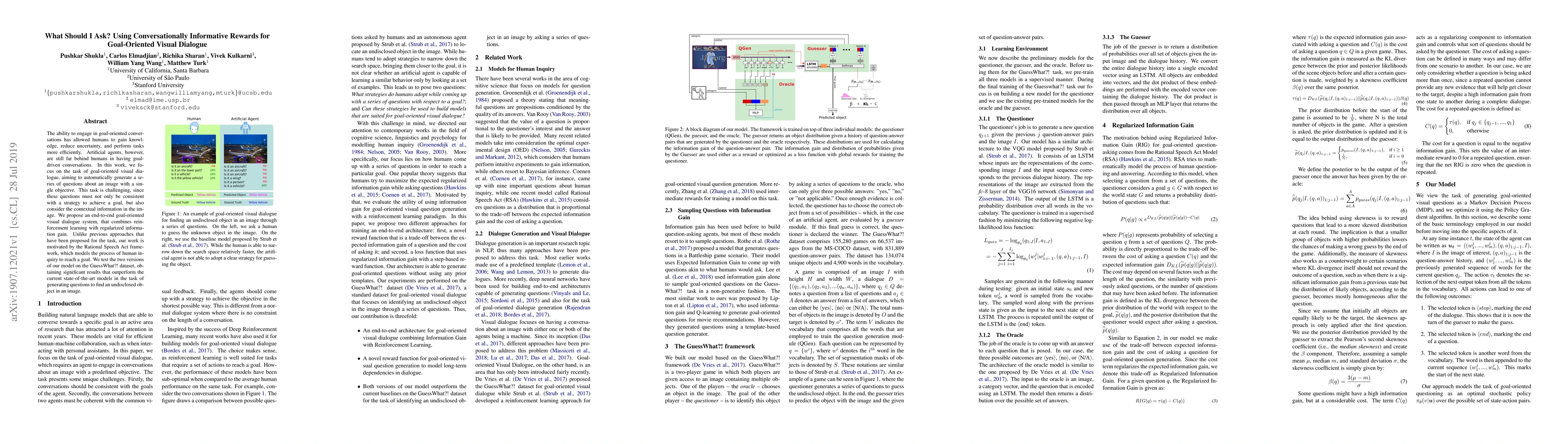The paper proposes an end-to-end goal-oriented visual dialogue system that combines reinforcement learning with regularized information gain, inspired by the Rational Speech Act framework. It's trained and tested on the GuessWhat?! dataset.