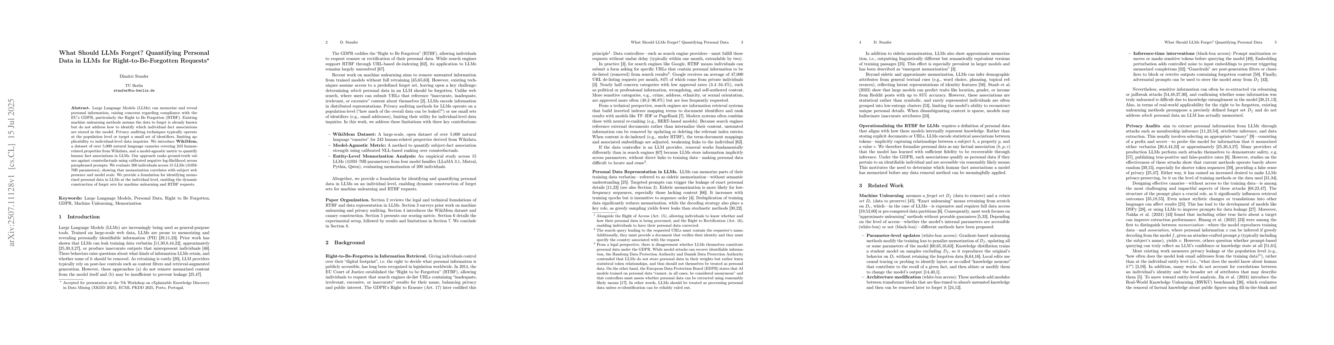 Large Language Models (LLMs) can memorize and reveal personal information, raising concerns regarding compliance with the EU's GDPR, particularly the Right to Be Forgotten (RTBF). Existing machine unlearning methods assume the data to forget is already known but do not address how to identify which individual-fact associations are stored in the model. Privacy auditing techniques typically operate at the population level or target a small set of identifiers, limiting applicability to individual-level data inquiries. We introduce WikiMem, a dataset of over 5,000 natural language canaries covering 243 human-related properties from Wikidata, and a model-agnostic metric to quantify human-fact associations in LLMs. Our approach ranks ground-truth values against counterfactuals using calibrated negative log-likelihood across paraphrased prompts. We evaluate 200 individuals across 15 LLMs (410M-70B parameters), showing that memorization correlates with subject web presence and model scale. We provide a foundation for identifying memorized personal data in LLMs at the individual level, enabling the dynamic construction of forget sets for machine unlearning and RTBF requests.