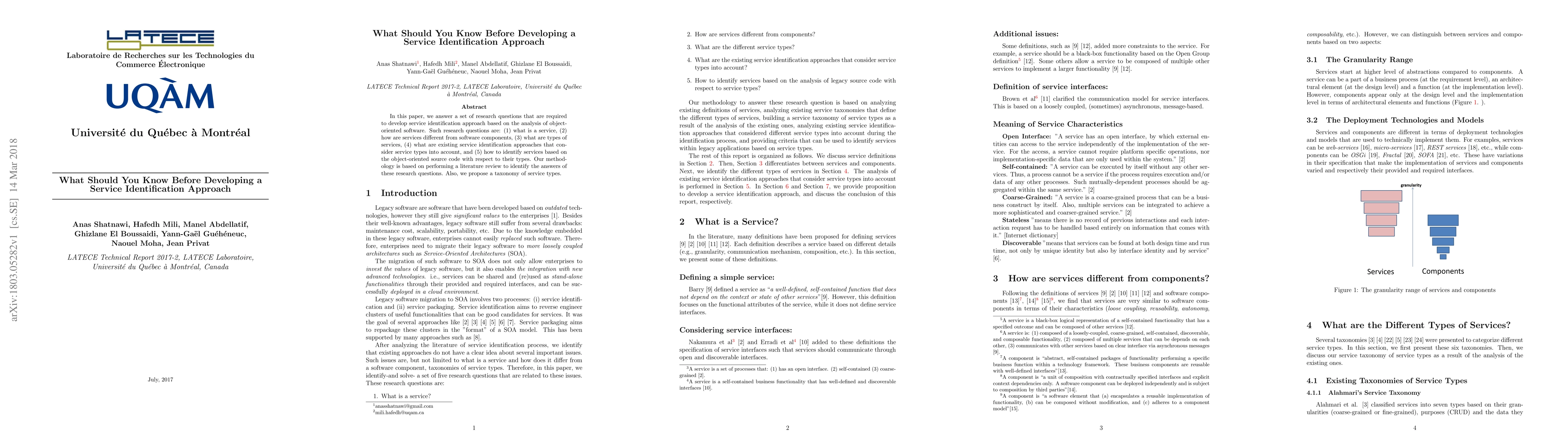In this paper, we answer a set of research questions that are required to develop service identification approach based on the analysis of object- oriented software. Such research questions are: (1) what is a service, (2) how are services different from software components, (3) what are types of services, (4) what are existing service identification approaches that consider service types into account, and (5) how to identify services based on the object-oriented source code with respect to their types. Our methodology is based on performing a literature review to identify the answers of these research questions. Also, we propose a taxonomy of service types.
