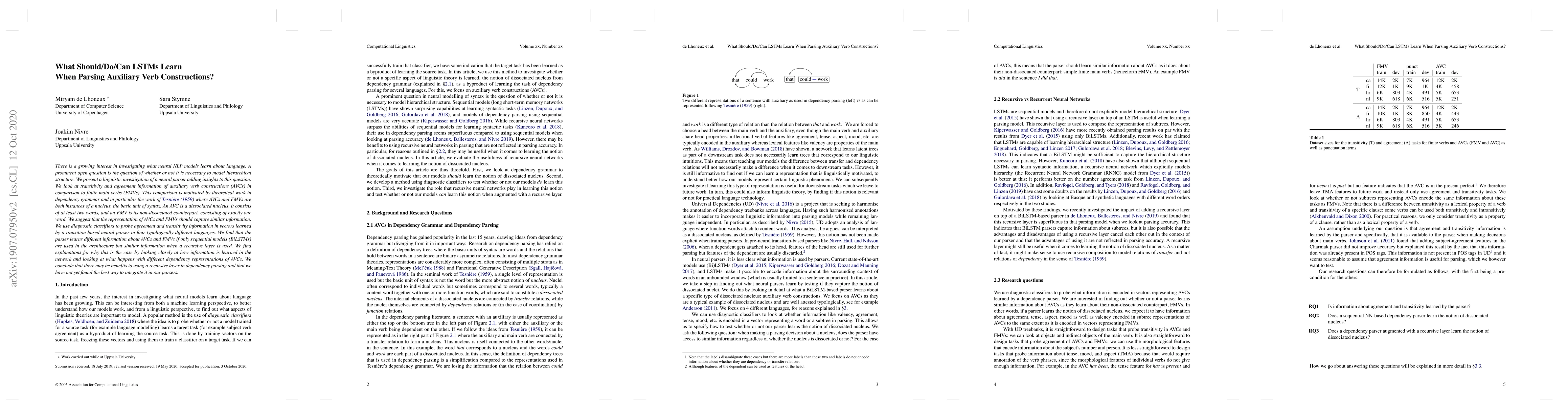 There is a growing interest in investigating what neural NLP models learn about language. A prominent open question is the question of whether or not it is necessary to model hierarchical structure. We present a linguistic investigation of a neural parser adding insights to this question. We look at transitivity and agreement information of auxiliary verb constructions (AVCs) in comparison to finite main verbs (FMVs). This comparison is motivated by theoretical work in dependency grammar and in particular the work of Tesni\`ere (1959) where AVCs and FMVs are both instances of a nucleus, the basic unit of syntax. An AVC is a dissociated nucleus, it consists of at least two words, and an FMV is its non-dissociated counterpart, consisting of exactly one word. We suggest that the representation of AVCs and FMVs should capture similar information. We use diagnostic classifiers to probe agreement and transitivity information in vectors learned by a transition-based neural parser in four typologically different languages. We find that the parser learns different information about AVCs and FMVs if only sequential models (BiLSTMs) are used in the architecture but similar information when a recursive layer is used. We find explanations for why this is the case by looking closely at how information is learned in the network and looking at what happens with different dependency representations of AVCs. We conclude that there may be benefits to using a recursive layer in dependency parsing and that we have not yet found the best way to integrate it in our parsers.