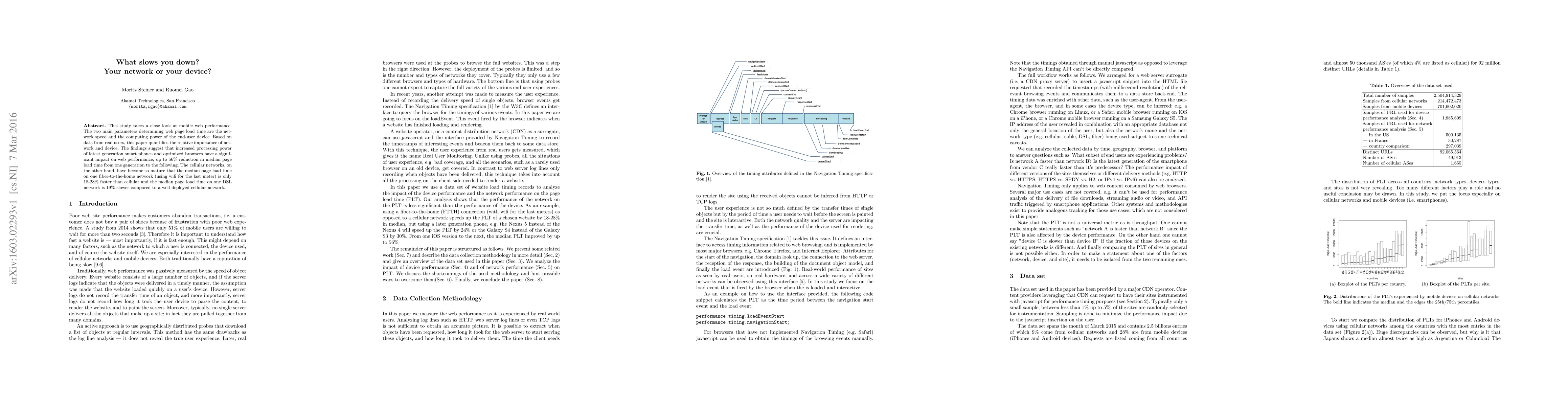 This study takes a close look at mobile web performance. The two main parameters determining web page load time are the network speed and the computing power of the end-user device. Based on data from real users, this paper quantifies the relative importance of network and device. The findings suggest that increased processing power of latest generation smart phones and optimized browsers have a significant impact on web performance; up to 56% reduction in median page load time from one generation to the following. The cellular networks, on the other hand, have become so mature that the median page load time on one fiber-to-the-home network (using wifi for the last meter) is only 18-28% faster than cellular and the median page load time on one DSL network is 19% slower compared to a well-deployed cellular network.