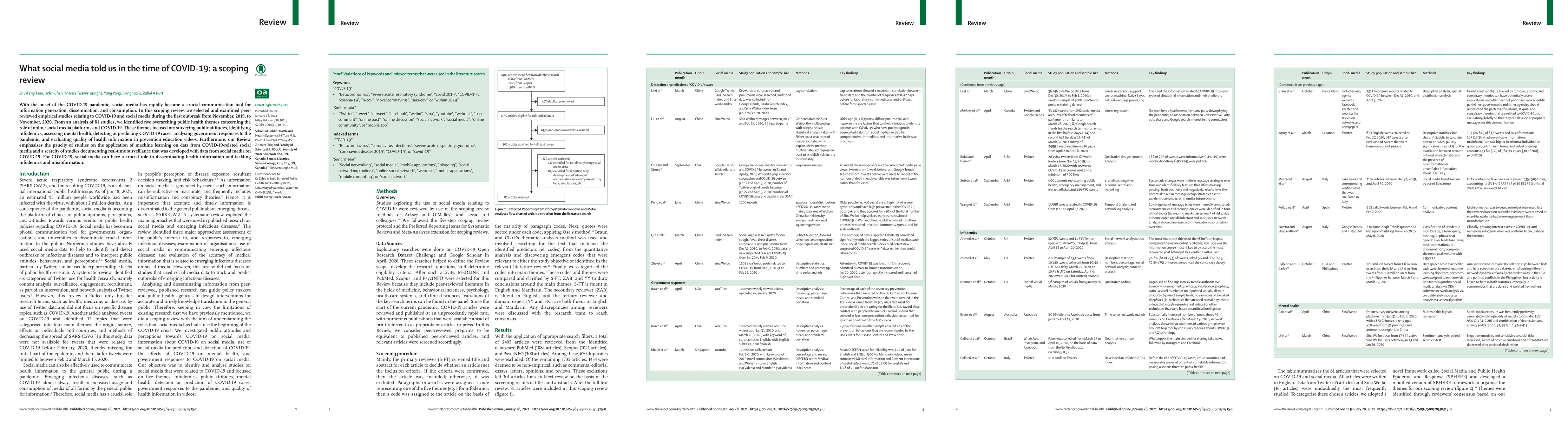 With the onset of COVID-19 pandemic, social media has rapidly become a crucial communication tool for information generation, dissemination, and consumption. In this scoping review, we selected and examined peer-reviewed empirical studies relating to COVID-19 and social media during the first outbreak starting in November 2019 until May 2020. From an analysis of 81 studies, we identified five overarching public health themes concerning the role of online social platforms and COVID-19. These themes focused on: (i) surveying public attitudes, (ii) identifying infodemics, (iii) assessing mental health, (iv) detecting or predicting COVID-19 cases, (v) analyzing government responses to the pandemic, and (vi) evaluating quality of health information in prevention education videos. Furthermore, our review highlights the paucity of studies on the application of machine learning on social media data related to COVID-19 and a lack of studies documenting real-time surveillance developed with social media data on COVID-19. For COVID-19, social media can play a crucial role in disseminating health information as well as tackling infodemics and misinformation.