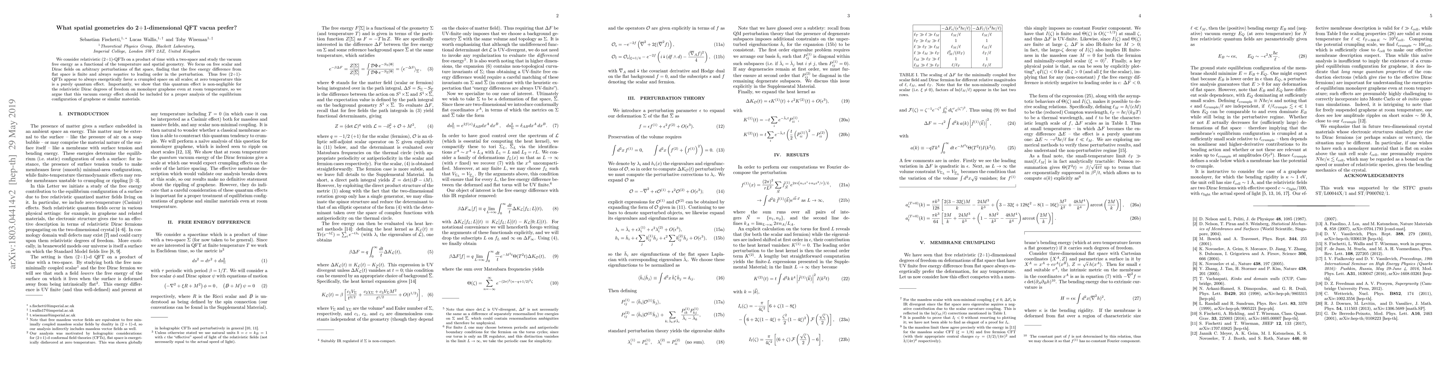 We consider relativistic (2+1)-QFTs on a product of time with a two-space and study the vacuum free energy as a functional of the temperature and spatial geometry. We focus on free scalar and Dirac fields on arbitrary perturbations of flat space, finding that the free energy difference from flat space is finite and always \textit{negative} to leading order in the perturbation. Thus free (2+1)-QFTs appear to always energetically favor a crumpled space on all scales; at zero temperature this is a purely quantum effect. Importantly, we show that this quantum effect is non-negligible for the relativistic Dirac degrees of freedom on monolayer graphene even at room temperature, so we argue that this vacuum energy effect should be included for a proper analysis of the equilibrium configuration of graphene or similar materials.
