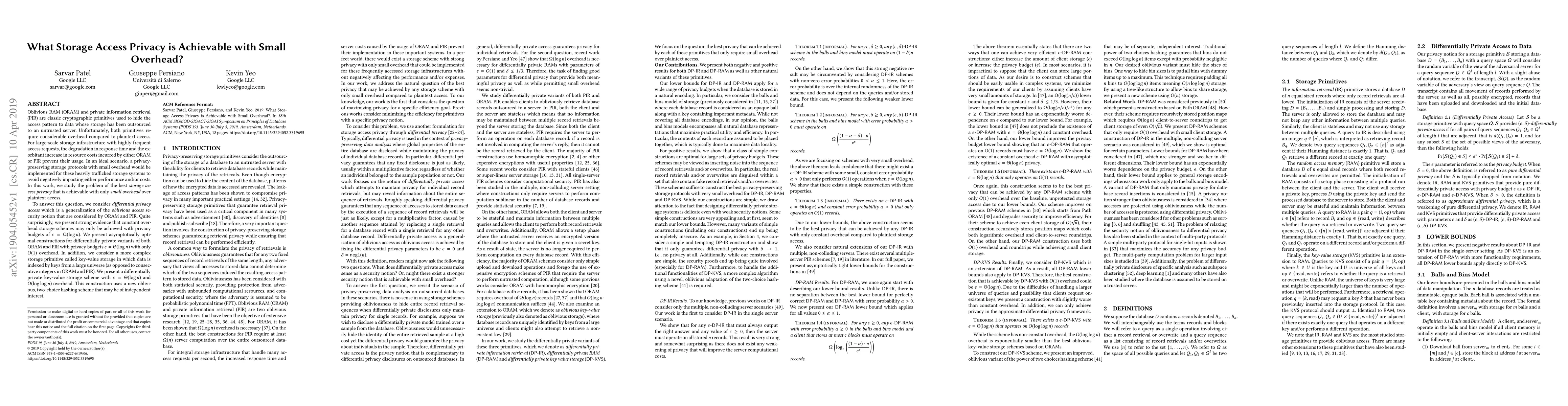This paper explores the feasibility of achieving storage access privacy with minimal overhead, proposing differentially private variants of ORAM and PIR that maintain $\epsilon = \Theta(\log n)$ privacy budgets with $O(1)$ overhead. It also introduces a differentially private key-value storage scheme with $\epsilon = \Theta(\log n)$ and $O(\log\log n)$ overhead.