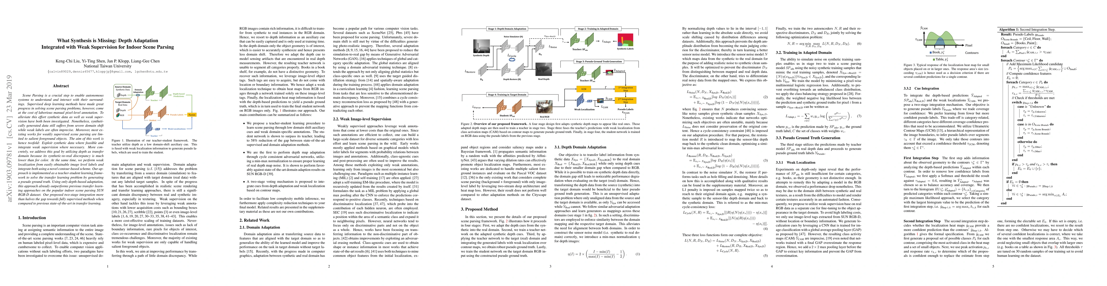 Scene Parsing is a crucial step to enable autonomous systems to understand and interact with their surroundings. Supervised deep learning methods have made great progress in solving scene parsing problems, however, come at the cost of laborious manual pixel-level annotation. To alleviate this effort synthetic data as well as weak supervision have both been investigated. Nonetheless, synthetically generated data still suffers from severe domain shift while weak labels are often imprecise. Moreover, most existing works for weakly supervised scene parsing are limited to salient foreground objects. The aim of this work is hence twofold: Exploit synthetic data where feasible and integrate weak supervision where necessary. More concretely, we address this goal by utilizing depth as transfer domain because its synthetic-to-real discrepancy is much lower than for color. At the same time, we perform weak localization from easily obtainable image level labels and integrate both using a novel contour-based scheme. Our approach is implemented as a teacher-student learning framework to solve the transfer learning problem by generating a pseudo ground truth. Using only depth-based adaptation, this approach already outperforms previous transfer learning approaches on the popular indoor scene parsing SUN RGB-D dataset. Our proposed two-stage integration more than halves the gap towards fully supervised methods when compared to previous state-of-the-art in transfer learning.