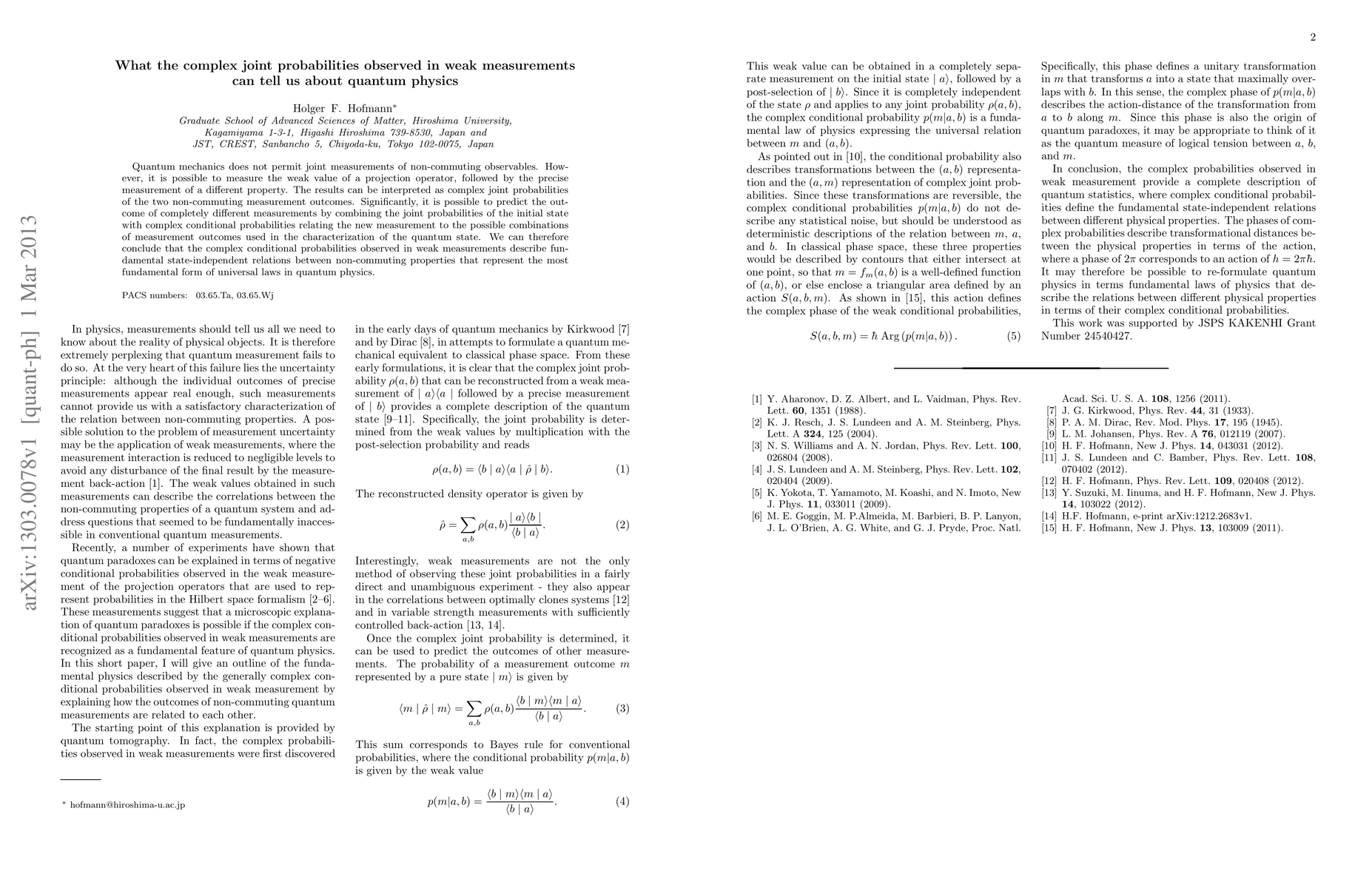 This paper explores how weak measurements, which allow the weak value of a projection operator to be determined alongside a subsequent precise measurement, reveal complex joint probabilities for non-commuting observables. It concludes that these complex conditional probabilities reveal fundamental, state-independent relations between such properties, embodying universal laws in quantum physics.