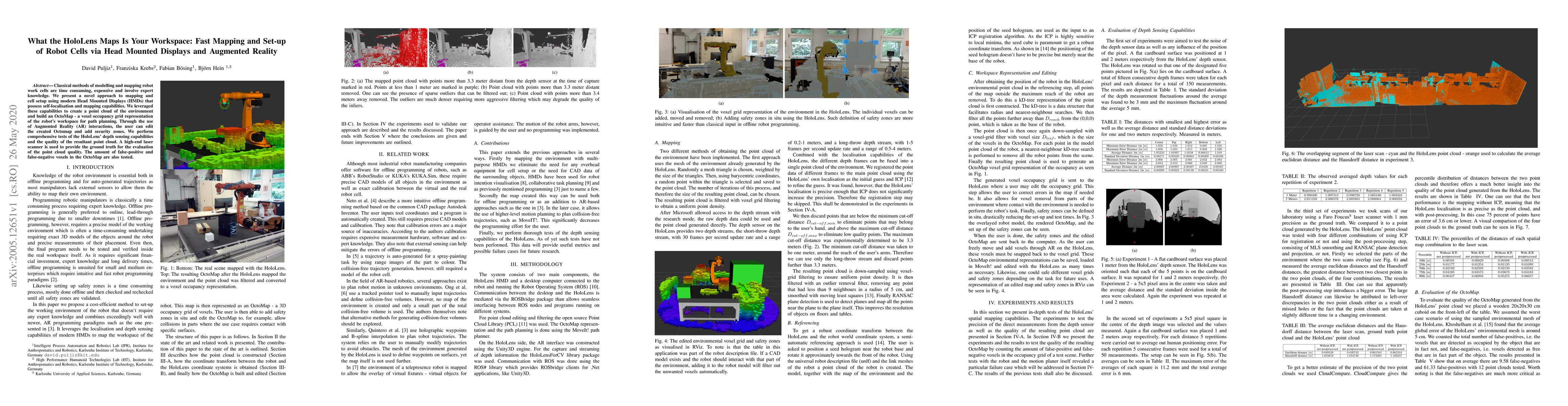 This paper introduces a new method for quickly mapping and setting up robot cells using Head Mounted Displays (HMDs) with self-localization and mapping features. The approach generates a point cloud and an OctoMap for efficient path planning, augmented with AR for user interaction and security zone addition. Tests compare the HoloLens' depth sensing to a high-end laser scanner to evaluate point cloud accuracy.