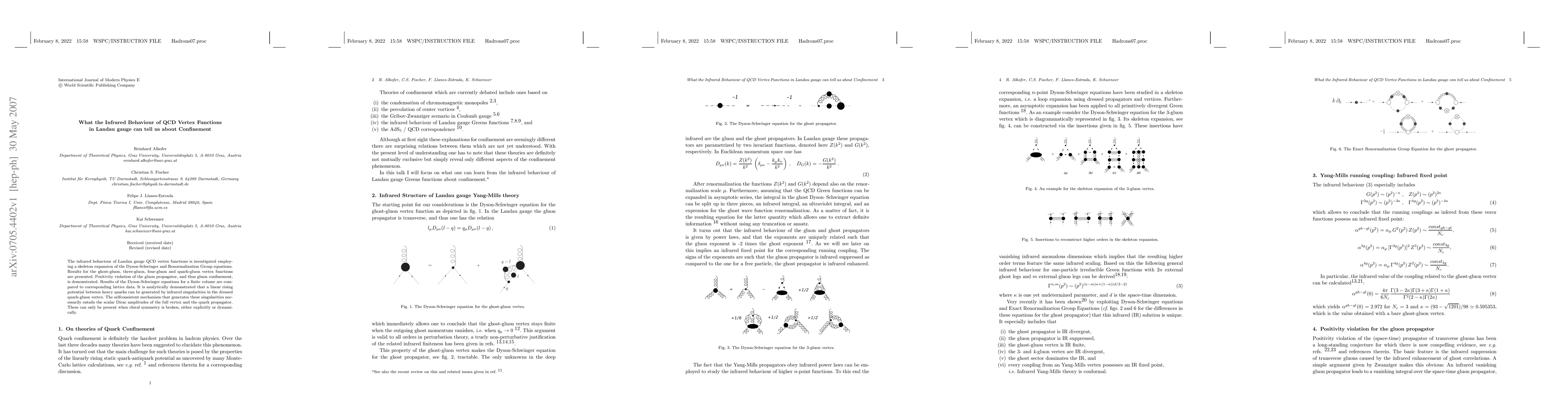 This paper investigates the infrared behavior of QCD vertex functions in the Landau gauge, showing that singularities in the dressed quark-gluon vertex can generate a linear rising potential indicative of confinement. The study employs Dyson-Schwinger and Renormalization Group equations, demonstrating the violation of gluon propagator positivity and linking it to chiral symmetry breaking.