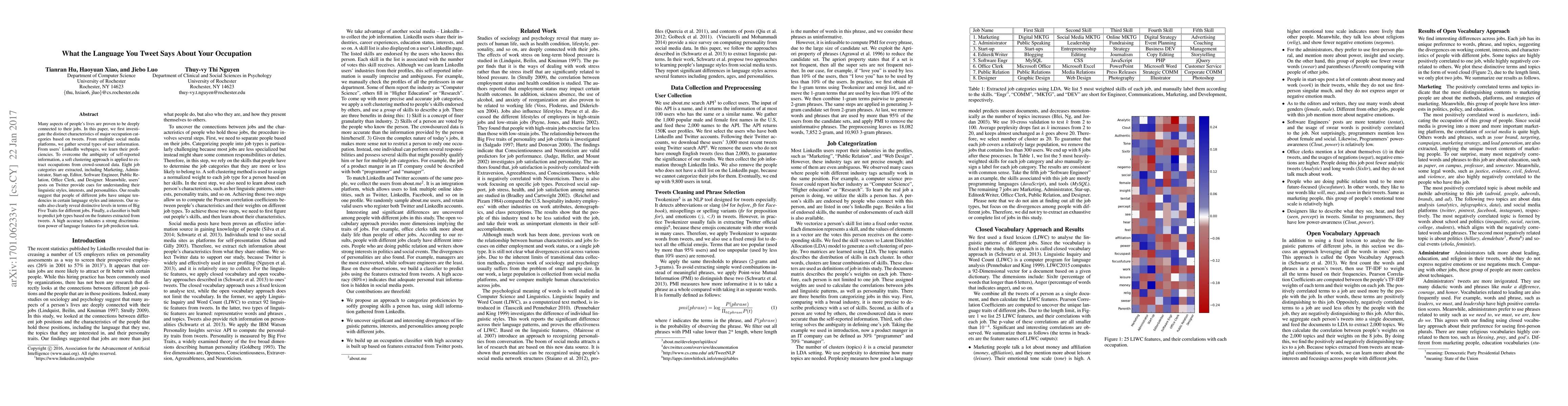 Many aspects of people's lives are proven to be deeply connected to their jobs. In this paper, we first investigate the distinct characteristics of major occupation categories based on tweets. From multiple social media platforms, we gather several types of user information. From users' LinkedIn webpages, we learn their proficiencies. To overcome the ambiguity of self-reported information, a soft clustering approach is applied to extract occupations from crowd-sourced data. Eight job categories are extracted, including Marketing, Administrator, Start-up, Editor, Software Engineer, Public Relation, Office Clerk, and Designer. Meanwhile, users' posts on Twitter provide cues for understanding their linguistic styles, interests, and personalities. Our results suggest that people of different jobs have unique tendencies in certain language styles and interests. Our results also clearly reveal distinctive levels in terms of Big Five Traits for different jobs. Finally, a classifier is built to predict job types based on the features extracted from tweets. A high accuracy indicates a strong discrimination power of language features for job prediction task.
