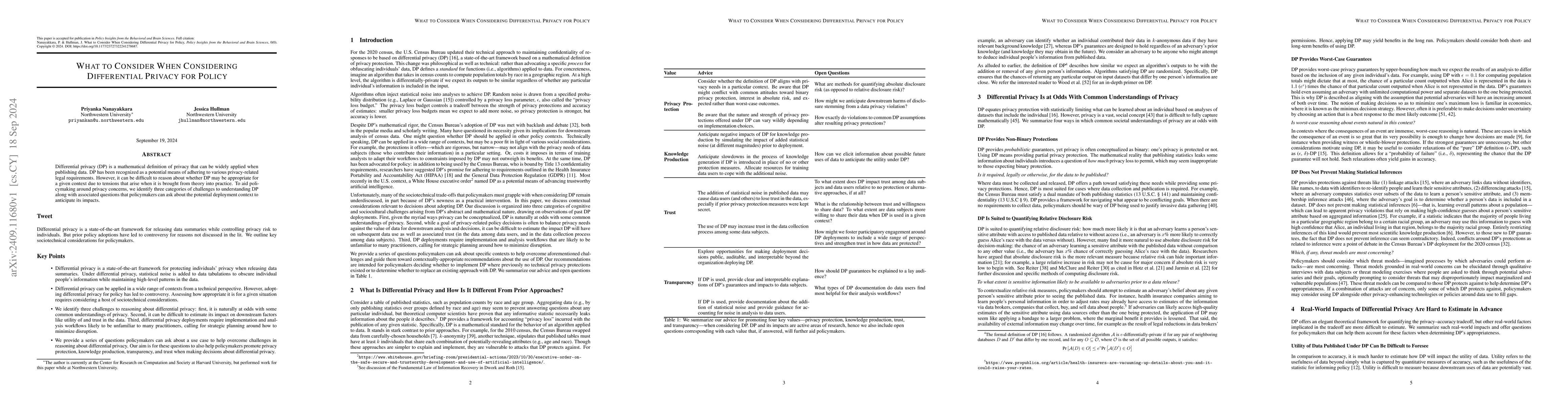 This paper explores the application of differential privacy in policymaking, highlighting three categories of challenges: theoretical understanding, practical implementation, and context-specific impacts. It provides policymakers with questions to evaluate whether differential privacy is suitable for their specific context.