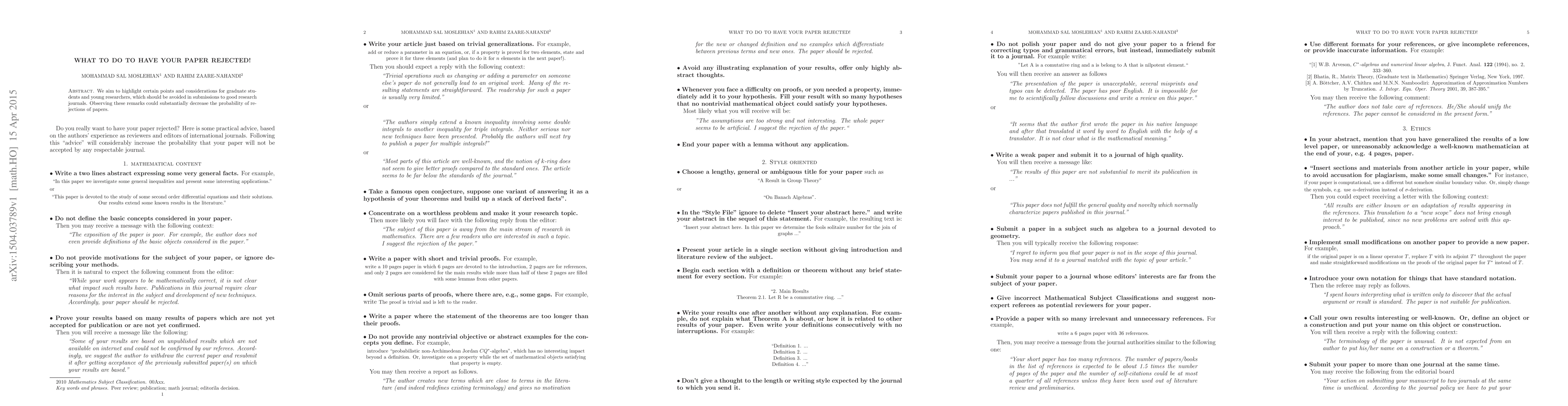This paper advises graduate students to avoid common mistakes that can lead to paper rejections in good research journals, aiming to decrease the probability of rejections through careful consideration.