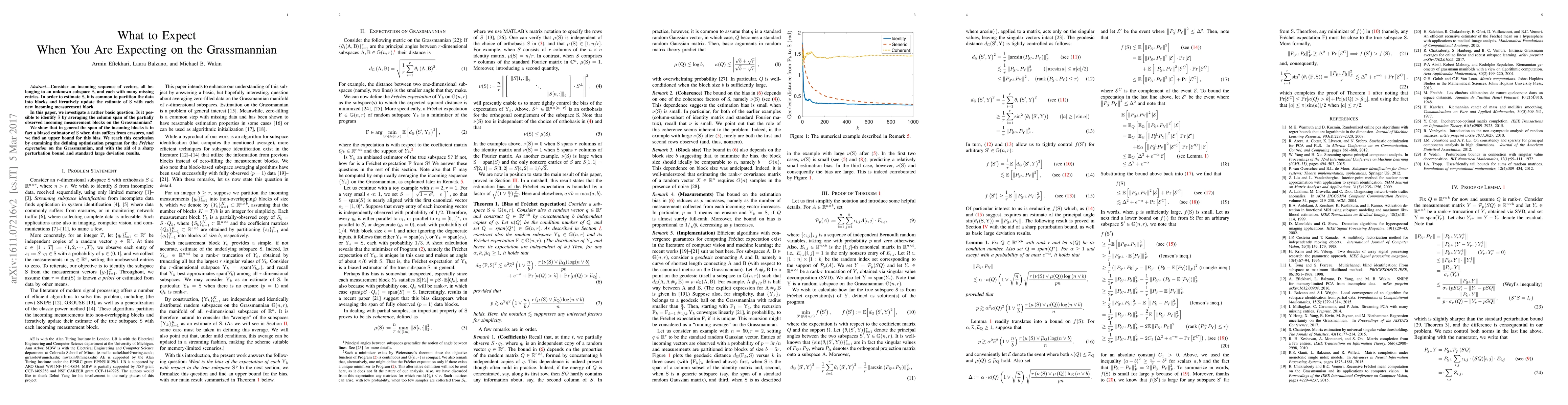 Researchers investigate if averaging column spans of incoming measurement blocks on the Grassmannian can identify an unknown subspace. They find that this method is biased and provide an upper bound for the bias when data suffers from erasures.