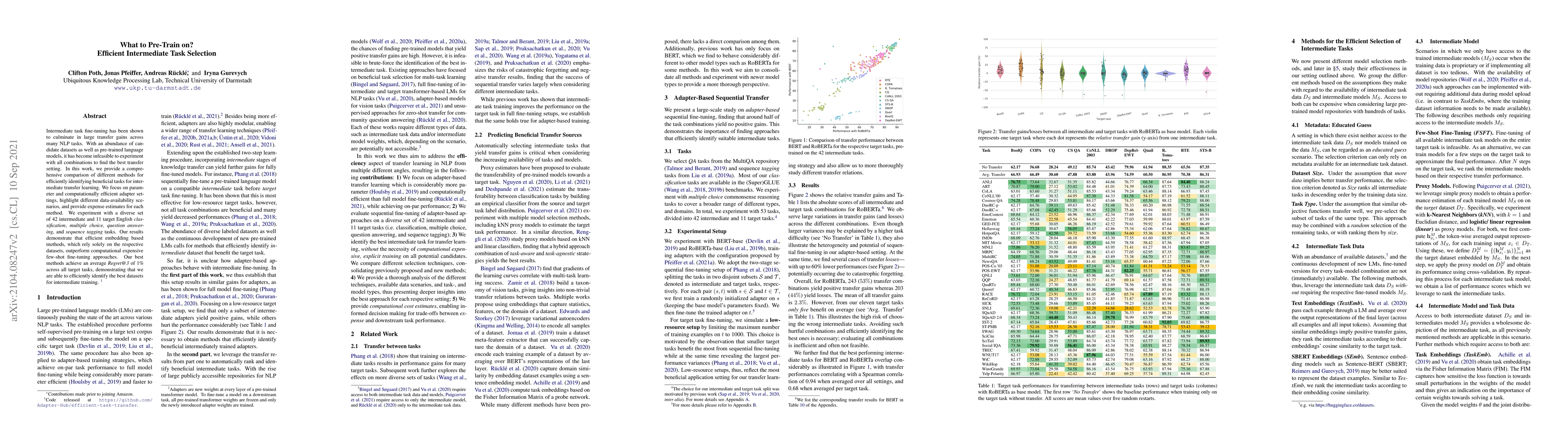 Intermediate task fine-tuning has been shown to culminate in large transfer gains across many NLP tasks. With an abundance of candidate datasets as well as pre-trained language models, it has become infeasible to run the cross-product of all combinations to find the best transfer setting. In this work we first establish that similar sequential fine-tuning gains can be achieved in adapter settings, and subsequently consolidate previously proposed methods that efficiently identify beneficial tasks for intermediate transfer learning. We experiment with a diverse set of 42 intermediate and 11 target English classification, multiple choice, question answering, and sequence tagging tasks. Our results show that efficient embedding based methods that rely solely on the respective datasets outperform computational expensive few-shot fine-tuning approaches. Our best methods achieve an average Regret@3 of less than 1% across all target tasks, demonstrating that we are able to efficiently identify the best datasets for intermediate training.