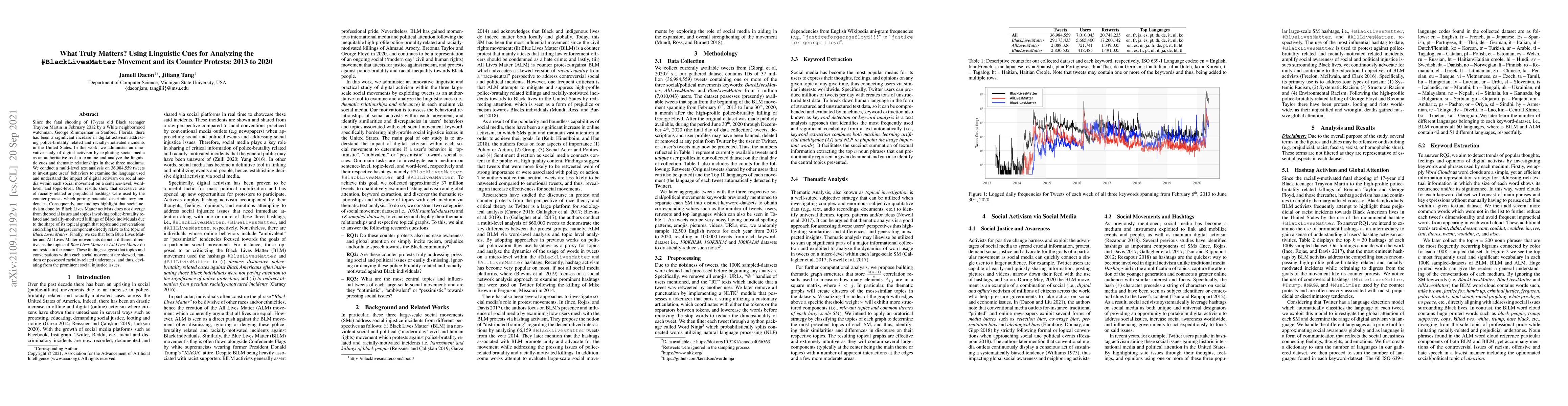 This study analyzes 36,984,559 tweets from the #BlackLivesMatter movement and its counter protests from 2013 to 2020, using linguistic cues to explore social media activism. Results indicate that counter protests often use racially-related hashtags, suggesting discriminatory tendencies, while #BlackLivesMatter maintains focus on police brutality and racial killings.