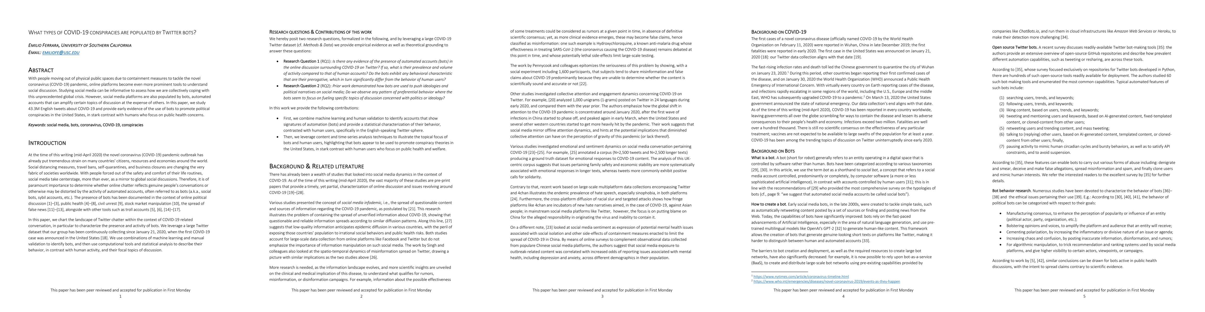 With people moving out of physical public spaces due to containment measures to tackle the novel coronavirus (COVID-19) pandemic, online platforms become even more prominent tools to understand social discussion. Studying social media can be informative to assess how we are collectively coping with this unprecedented global crisis. However, social media platforms are also populated by bots, automated accounts that can amplify certain topics of discussion at the expense of others. In this paper, we study 43.3M English tweets about COVID-19 and provide early evidence of the use of bots to promote political conspiracies in the United States, in stark contrast with humans who focus on public health concerns.