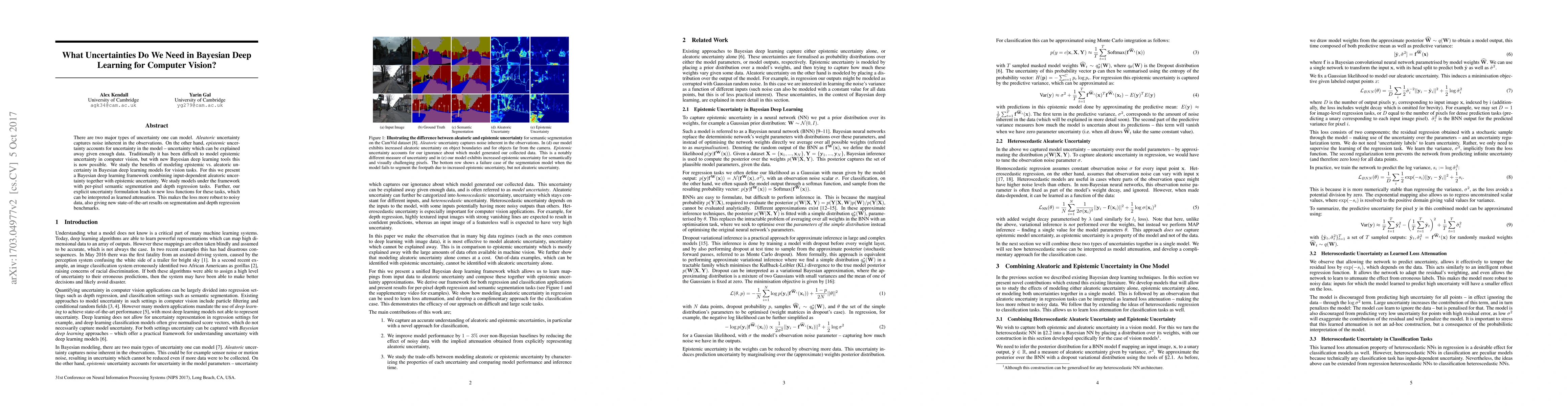 This paper explores the modeling of aleatoric and epistemic uncertainties in Bayesian deep learning for computer vision tasks, presenting a framework that combines both types of uncertainties. The study demonstrates improved performance in semantic segmentation and depth regression through new loss functions that enhance robustness to noisy data.