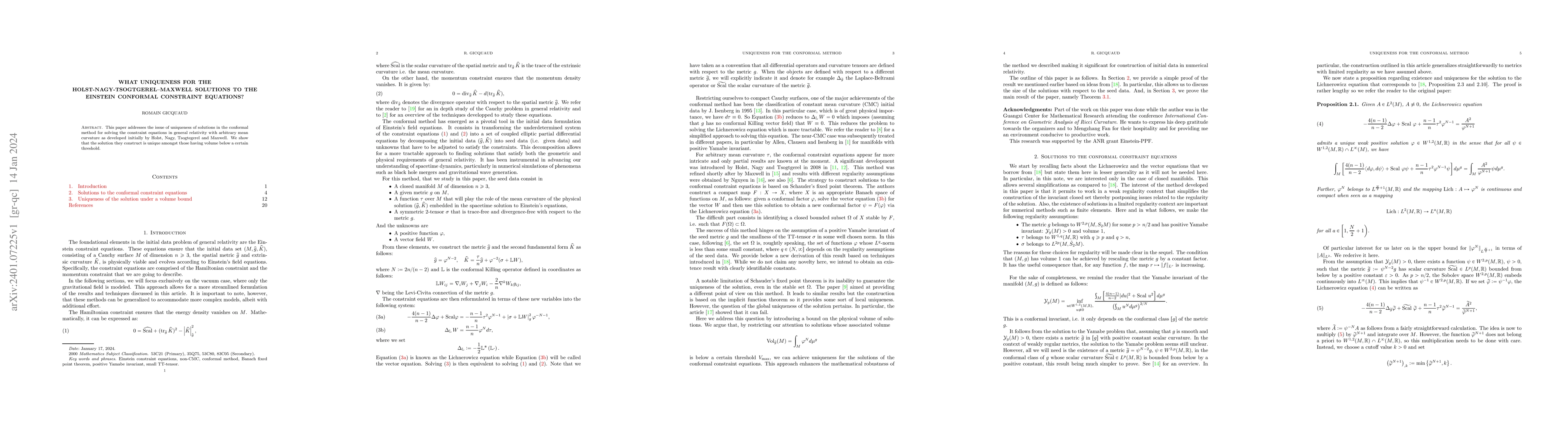 This paper investigates the uniqueness of solutions within the conformal method for solving Einstein's constraint equations, as developed by Holst, Nagy, Tsogtgerel, and Maxwell. It concludes that the proposed solution is unique for configurations with volume below a specific threshold.