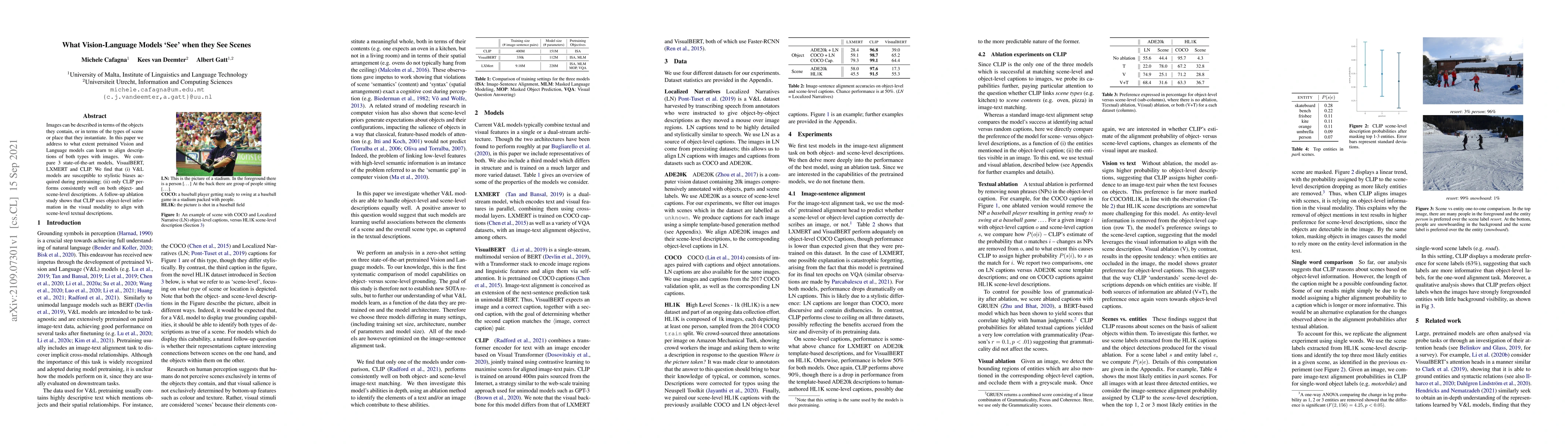 Images can be described in terms of the objects they contain, or in terms of the types of scene or place that they instantiate. In this paper we address to what extent pretrained Vision and Language models can learn to align descriptions of both types with images. We compare 3 state-of-the-art models, VisualBERT, LXMERT and CLIP. We find that (i) V&L models are susceptible to stylistic biases acquired during pretraining; (ii) only CLIP performs consistently well on both object- and scene-level descriptions. A follow-up ablation study shows that CLIP uses object-level information in the visual modality to align with scene-level textual descriptions.