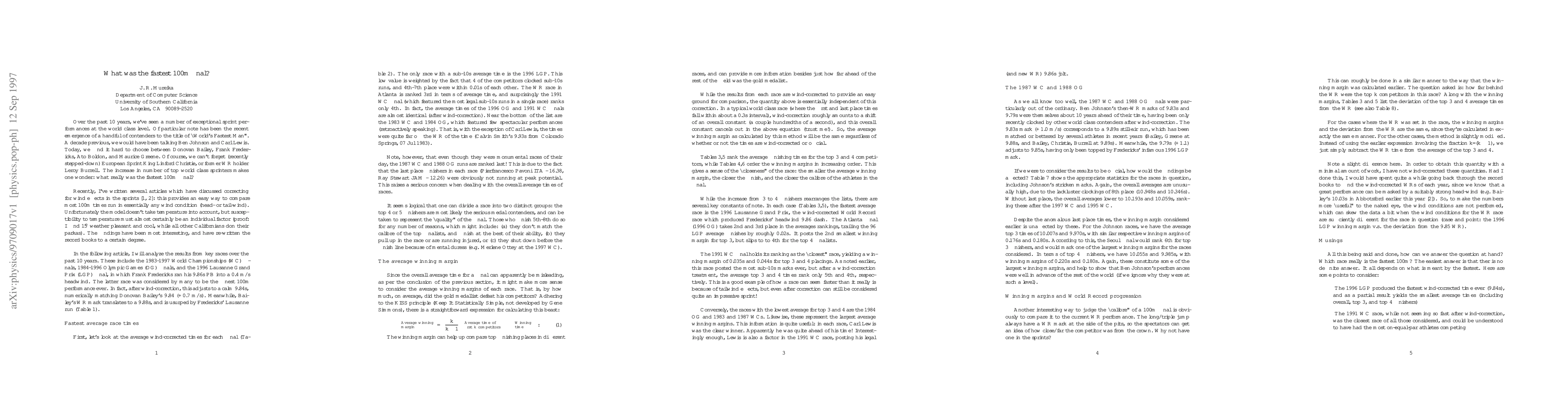 This research paper analyzes 100m final performances from Olympic Games and World Championships to determine the fastest time, finding that Frank Fredericks' wind-aided run remains the quickest at 9.86s.