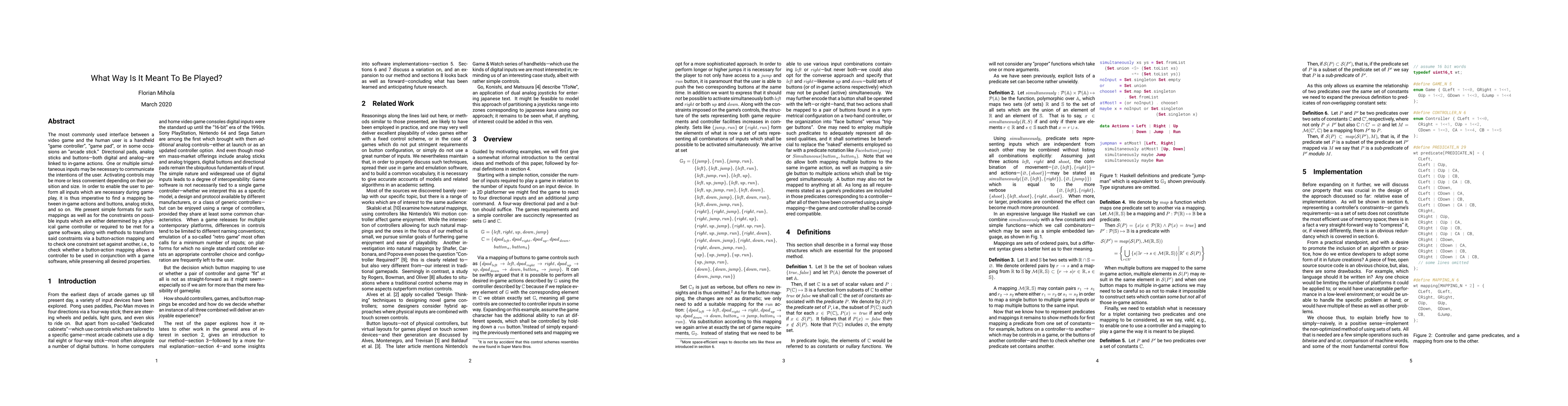 The most commonly used interface between a video game and the human user is a handheld "game controller", "game pad", or in some occasions an "arcade stick." Directional pads, analog sticks and buttons - both digital and analog - are linked to in-game actions. One or multiple simultaneous inputs may be necessary to communicate the intentions of the user. Activating controls may be more or less convenient depending on their position and size. In order to enable the user to perform all inputs which are necessary during gameplay, it is thus imperative to find a mapping between in-game actions and buttons, analog sticks, and so on. We present simple formats for such mappings as well as for the constraints on possible inputs which are either determined by a physical game controller or required to be met for a game software, along with methods to transform said constraints via a button-action mapping and to check one constraint set against another, i.e., to check whether a button-action mapping allows a controller to be used in conjunction with a game software, while preserving all desired properties.