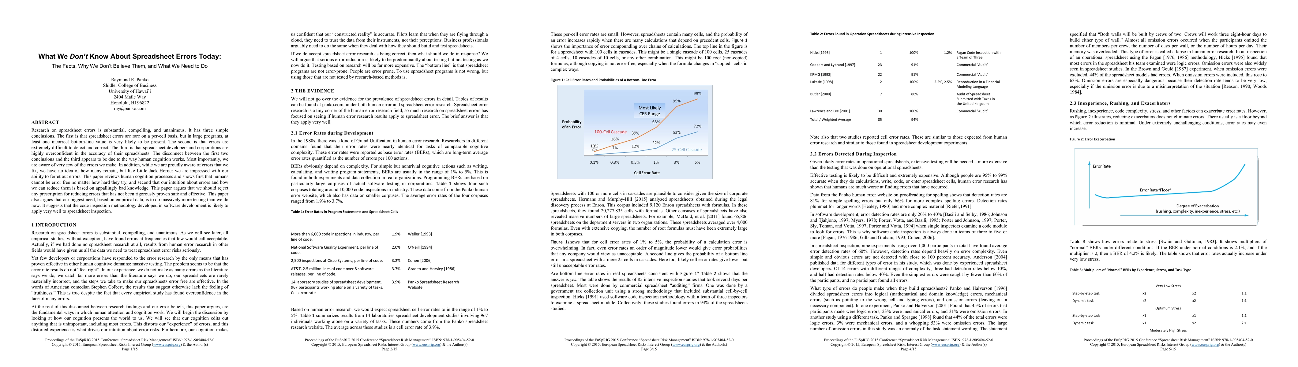 This paper highlights the prevalence and difficulty in detecting spreadsheet errors, noting that while individual errors are rare, large programs are likely to contain at least one incorrect bottom-line value. It argues that developers' overconfidence in spreadsheet accuracy stems from flawed human cognition and suggests that rigorous testing, akin to software inspection, is urgently needed to improve spreadsheet reliability.