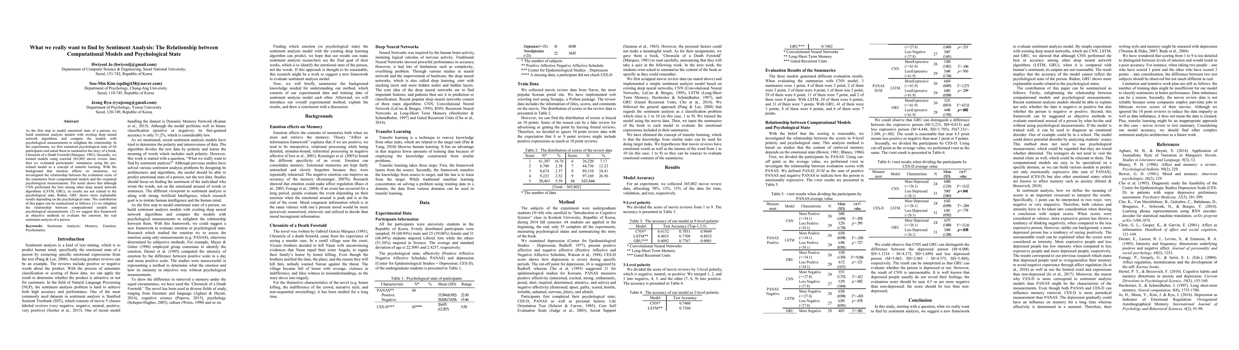 As the first step to model emotional state of a person, we build sentiment analysis models with existing deep neural network algorithms and compare the models with psychological measurements to enlighten the relationship. In the experiments, we first examined psychological state of 64 participants and asked them to summarize the story of a book, Chronicle of a Death Foretold (Marquez, 1981). Secondly, we trained models using crawled 365,802 movie review data; then we evaluated participants' summaries using the pretrained model as a concept of transfer learning. With the background that emotion affects on memories, we investigated the relationship between the evaluation score of the summaries from computational models and the examined psychological measurements. The result shows that although CNN performed the best among other deep neural network algorithms (LSTM, GRU), its results are not related to the psychological state. Rather, GRU shows more explainable results depending on the psychological state. The contribution of this paper can be summarized as follows: (1) we enlighten the relationship between computational models and psychological measurements. (2) we suggest this framework as objective methods to evaluate the emotion; the real sentiment analysis of a person.