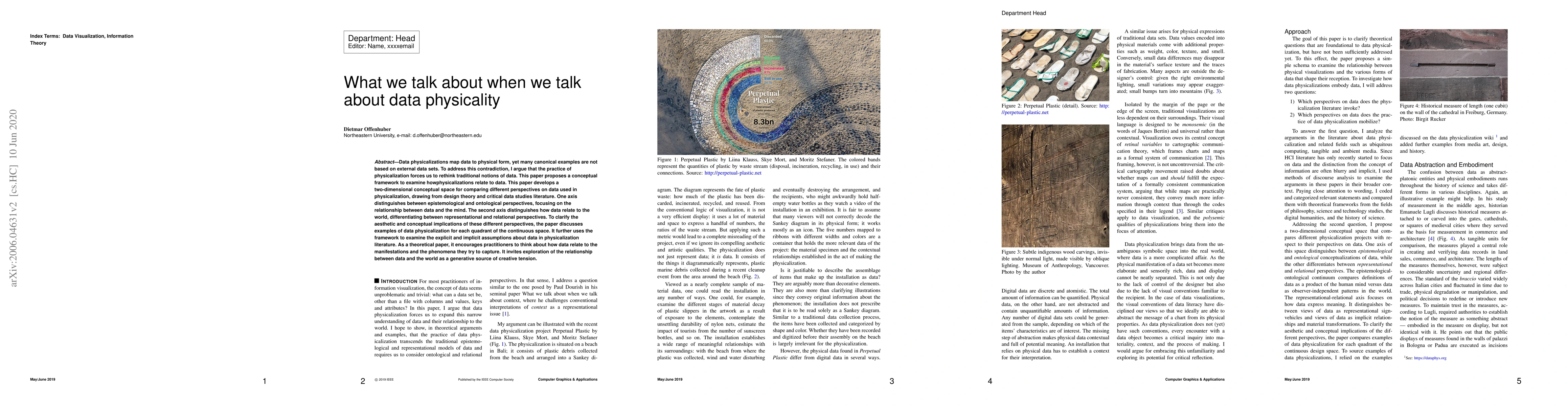 The paper develops a two-dimensional conceptual space for comparing different perspectives on data used in physicalization