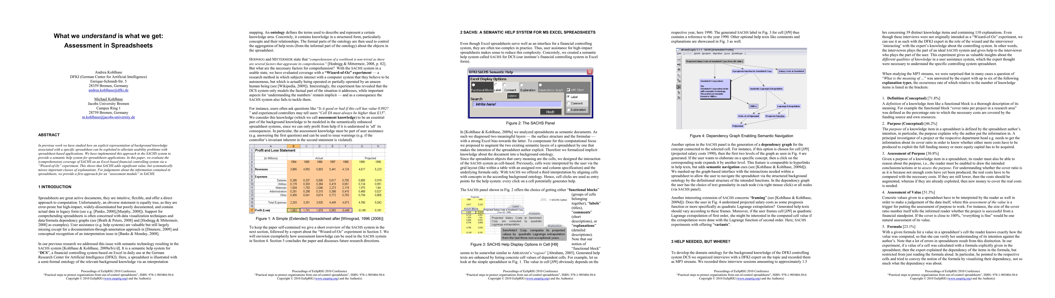 In previous work we have studied how an explicit representation of background knowledge associated with a specific spreadsheet can be exploited to alleviate usability problems with spreadsheet-based applications. We have implemented this approach in the SACHS system to provide a semantic help system for spreadsheets applications. In this paper, we evaluate the (comprehension) coverage of SACHS on an Excel-based financial controlling system via a "Wizard-of-Oz" experiment. This shows that SACHS adds significant value, but systematically misses important classes of explanations. For judgements about the information contained in spreadsheets, we provide a first approach for an "assessment module" in SACHS.