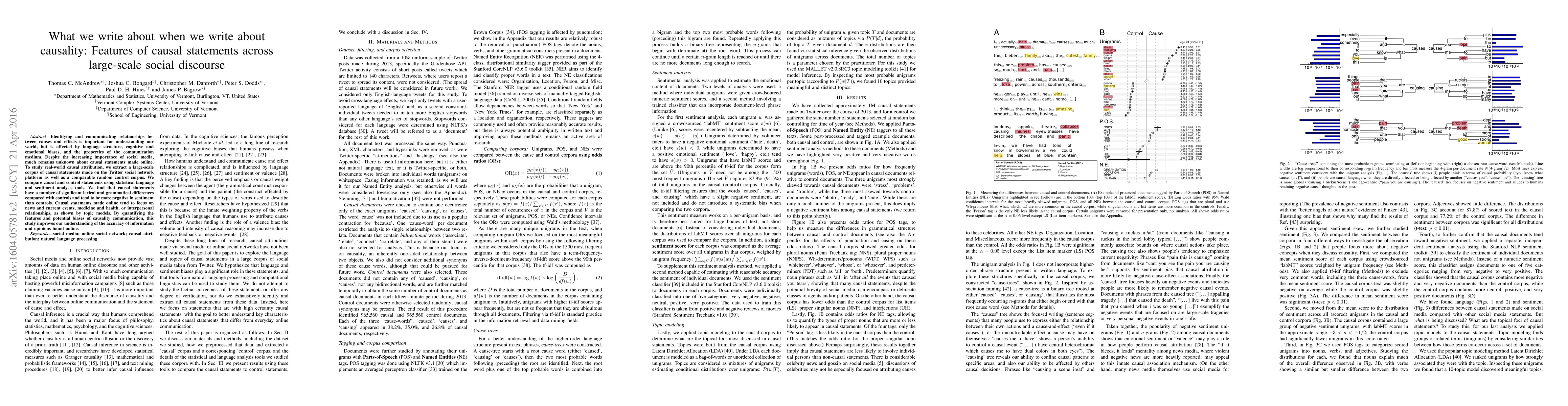 Identifying and communicating relationships between causes and effects is important for understanding our world, but is affected by language structure, cognitive and emotional biases, and the properties of the communication medium. Despite the increasing importance of social media, much remains unknown about causal statements made online. To study real-world causal attribution, we extract a large-scale corpus of causal statements made on the Twitter social network platform as well as a comparable random control corpus. We compare causal and control statements using statistical language and sentiment analysis tools. We find that causal statements have a number of significant lexical and grammatical differences compared with controls and tend to be more negative in sentiment than controls. Causal statements made online tend to focus on news and current events, medicine and health, or interpersonal relationships, as shown by topic models. By quantifying the features and potential biases of causality communication, this study improves our understanding of the accuracy of information and opinions found online.