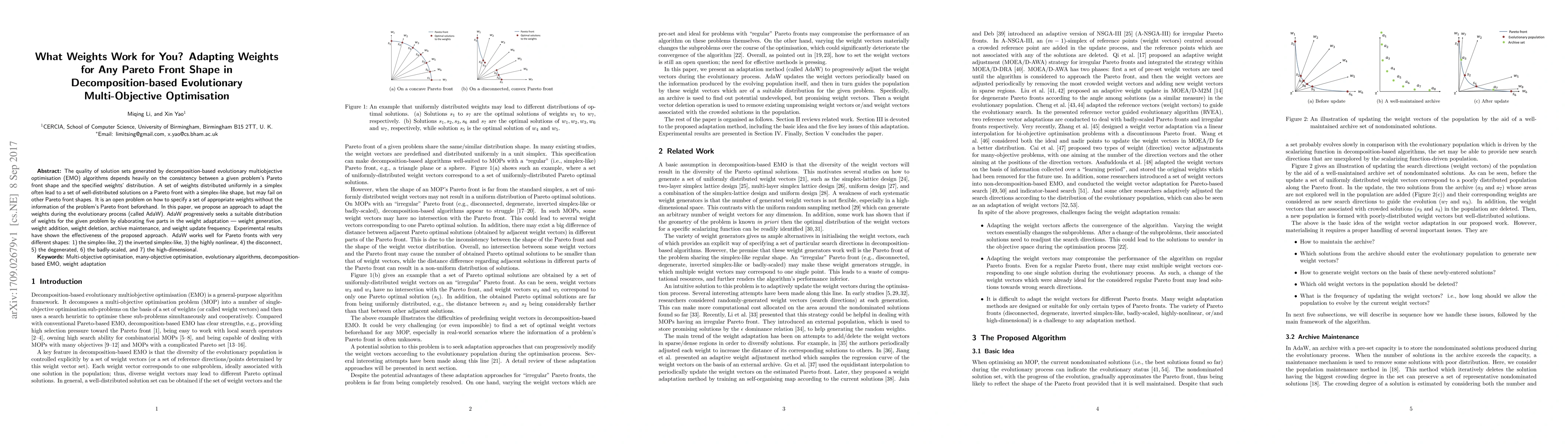 This paper proposes a method called AdaW to adapt weights for decomposition-based EMO algorithms to work with various Pareto front shapes, improving solution distribution and effectiveness in multi-objective optimization.