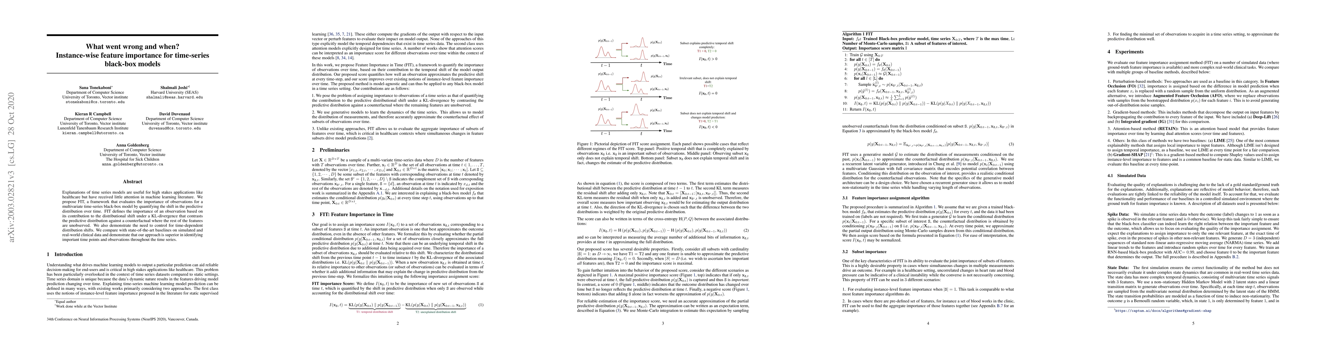 Explanations of time series models are useful for high stakes applications like healthcare but have received little attention in machine learning literature. We propose FIT, a framework that evaluates the importance of observations for a multivariate time-series black-box model by quantifying the shift in the predictive distribution over time. FIT defines the importance of an observation based on its contribution to the distributional shift under a KL-divergence that contrasts the predictive distribution against a counterfactual where the rest of the features are unobserved. We also demonstrate the need to control for time-dependent distribution shifts. We compare with state-of-the-art baselines on simulated and real-world clinical data and demonstrate that our approach is superior in identifying important time points and observations throughout the time series.