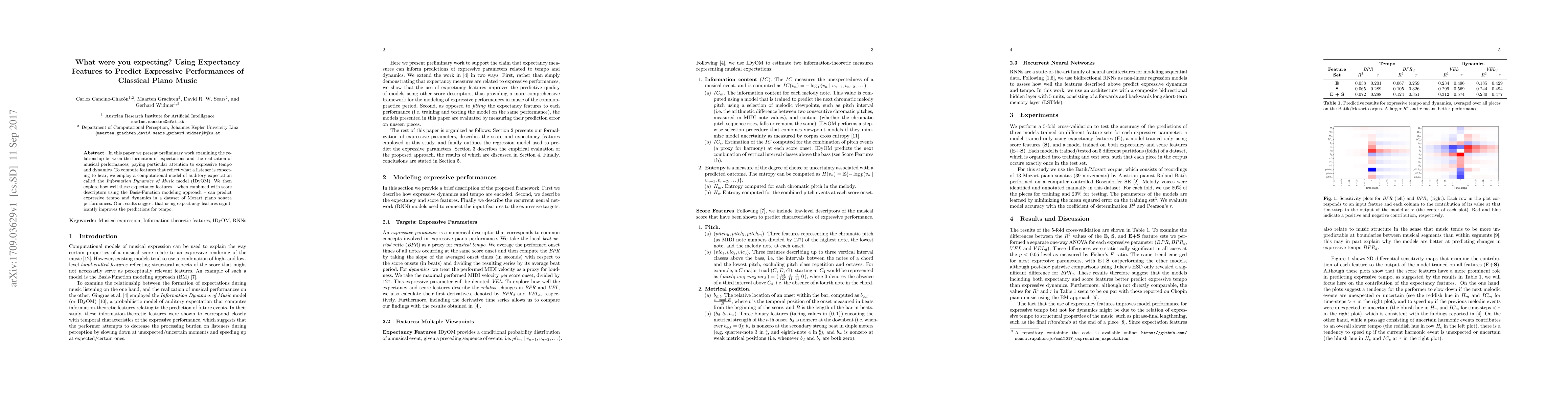 This paper explores how expectancy features derived from the IDyOM model predict expressive tempo and dynamics in classical piano performances, finding that these features, when combined with score descriptors, significantly enhance tempo prediction in Mozart piano sonatas.