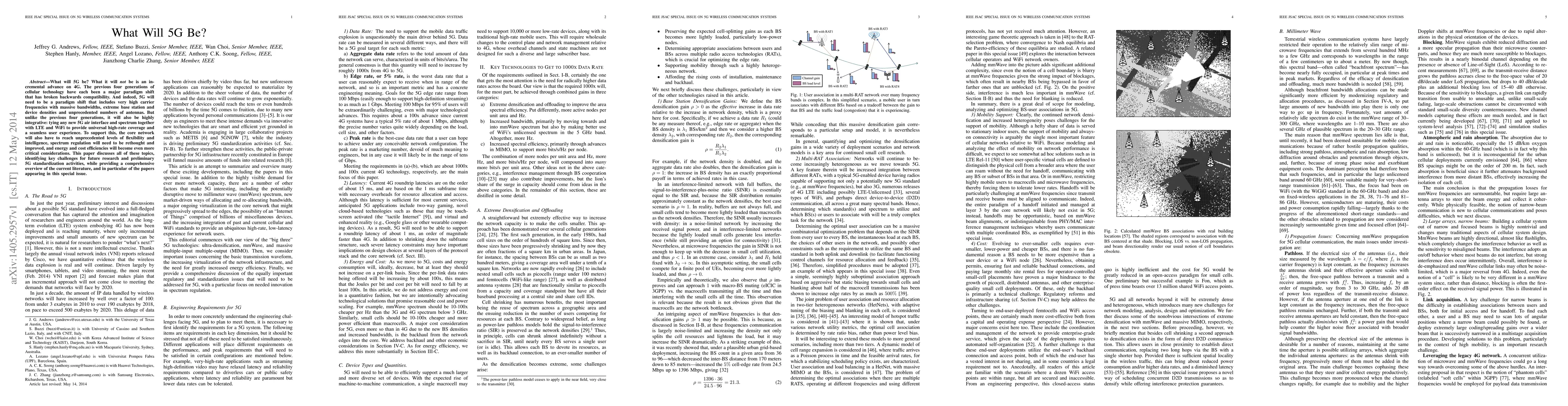 What will 5G be? What it will not be is an incremental advance on 4G. The previous four generations of cellular technology have each been a major paradigm shift that has broken backwards compatibility. And indeed, 5G will need to be a paradigm shift that includes very high carrier frequencies with massive bandwidths, extreme base station and device densities and unprecedented numbers of antennas. But unlike the previous four generations, it will also be highly integrative: tying any new 5G air interface and spectrum together with LTE and WiFi to provide universal high-rate coverage and a seamless user experience. To support this, the core network will also have to reach unprecedented levels of flexibility and intelligence, spectrum regulation will need to be rethought and improved, and energy and cost efficiencies will become even more critical considerations. This paper discusses all of these topics, identifying key challenges for future research and preliminary 5G standardization activities, while providing a comprehensive overview of the current literature, and in particular of the papers appearing in this special issue.