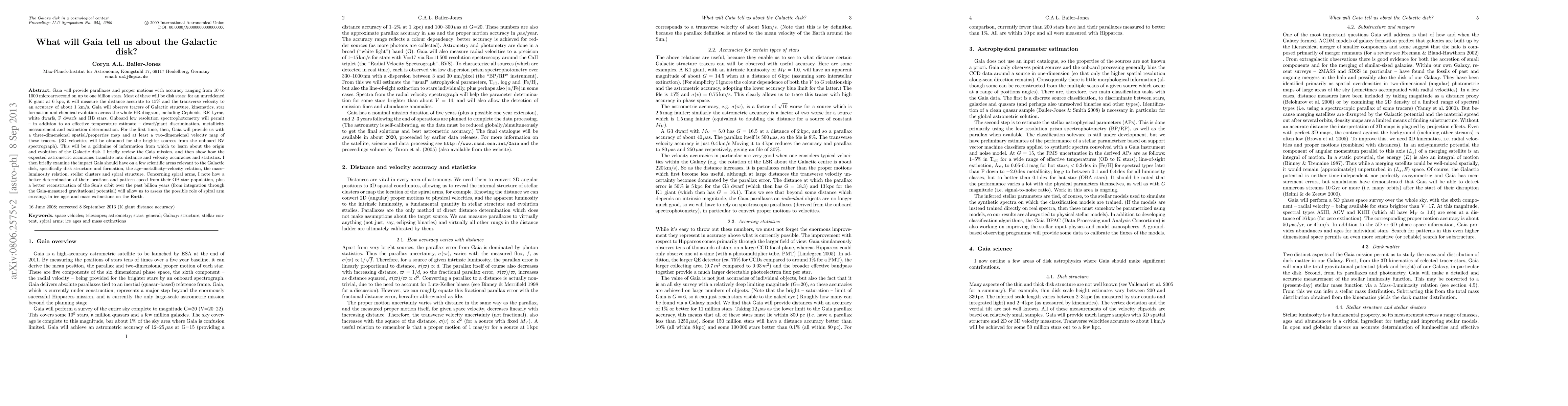 Gaia will provide parallaxes and proper motions with accuracy ranging from 10 to 1000 microarcsecond on up to one billion stars. Most of these will be disk stars: for an unreddened K giant at 6 kpc, it will measure the distance accurate to 15% and the transverse velocity to an accuracy of about 1 km/s. Gaia will observe tracers of Galactic structure across the whole HR diagram, including Cepheids, RR Lyrae, white dwarfs, F dwarfs and HB stars. Onboard low resolution spectrophotometry will permit -- in addition to a Teff estimate -- dwarf/giant discrimination, metallicity measurement and extinction determination. For the first time, then, Gaia will provide us with a 3D spatial/properties map and at least a 2D velocity map of these tracers (RVs will be obtained too for brighter stars.) This will be a goldmine of information from which to learn about the origin and evolution of the Galactic disk. I briefly review the Gaia mission, and then show how the expected astrometric accuracies translate into distance and velocity accuracies and statistics. I examine the impact Gaia should have on a few scientific areas relevant to the Galactic disk. I discuss how a better determination of the spiral arm locations and pattern speed, plus a better reconstruction of the Sun's orbit over the past billion years (from integration through the Gaia-measured gravitational potential) will allow us to assess the possible role of spiral arm crossings in ice ages and mass extinctions on the Earth.