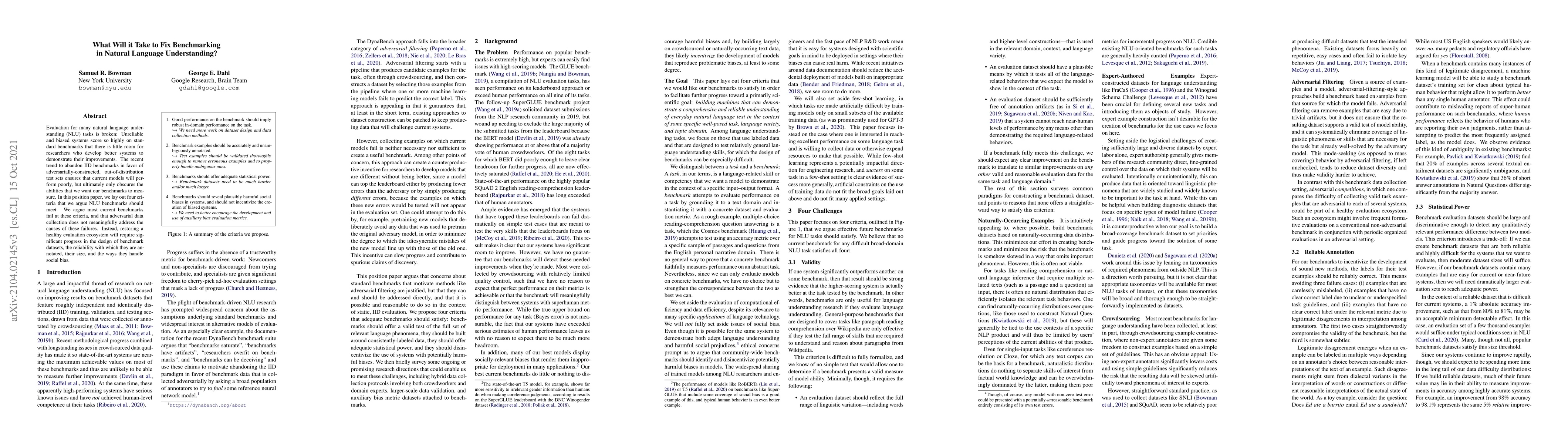 Evaluation for many natural language understanding (NLU) tasks is broken: Unreliable and biased systems score so highly on standard benchmarks that there is little room for researchers who develop better systems to demonstrate their improvements. The recent trend to abandon IID benchmarks in favor of adversarially-constructed, out-of-distribution test sets ensures that current models will perform poorly, but ultimately only obscures the abilities that we want our benchmarks to measure. In this position paper, we lay out four criteria that we argue NLU benchmarks should meet. We argue most current benchmarks fail at these criteria, and that adversarial data collection does not meaningfully address the causes of these failures. Instead, restoring a healthy evaluation ecosystem will require significant progress in the design of benchmark datasets, the reliability with which they are annotated, their size, and the ways they handle social bias.