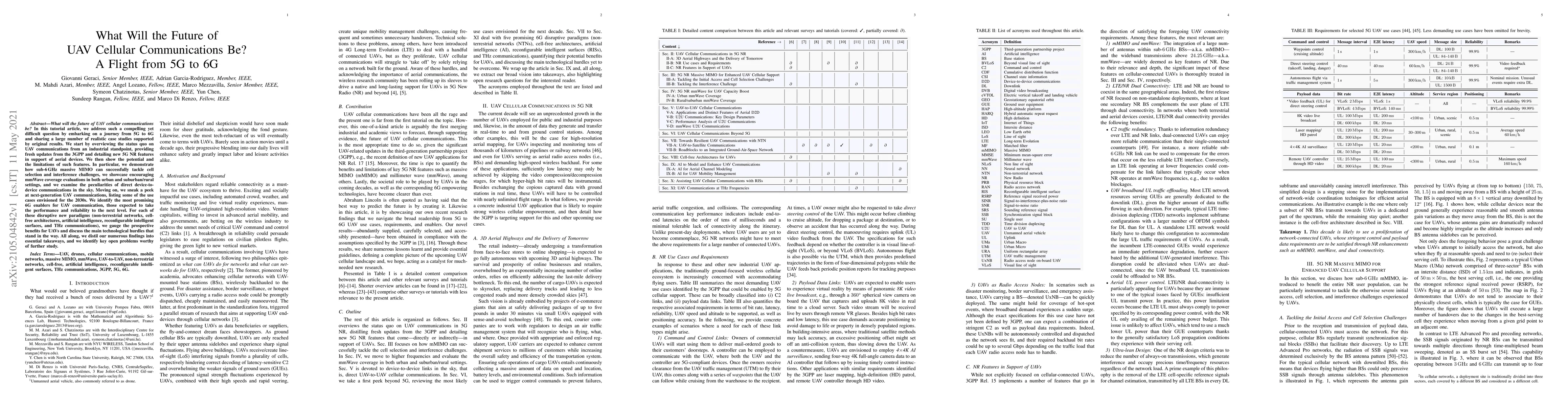 This paper explores the future of UAV cellular communications, transitioning from 5G to 6G, and evaluates current 5G NR features for aerial devices. It also anticipates 6G advancements, including non-terrestrial networks and THz communications, while identifying technological challenges and open research questions.