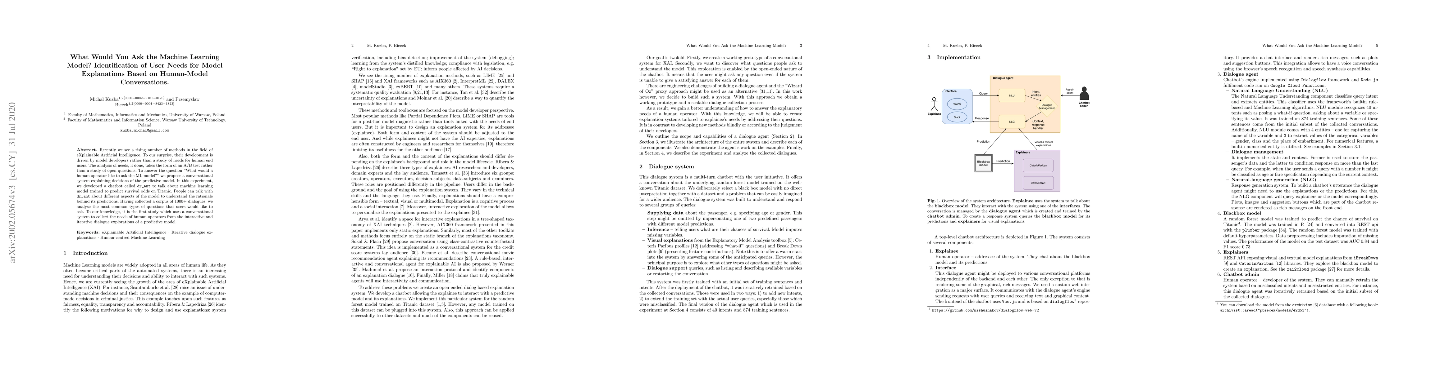 Recently we see a rising number of methods in the field of eXplainable Artificial Intelligence. To our surprise, their development is driven by model developers rather than a study of needs for human end users. The analysis of needs, if done, takes the form of an A/B test rather than a study of open questions. To answer the question "What would a human operator like to ask the ML model?" we propose a conversational system explaining decisions of the predictive model. In this experiment, we developed a chatbot called dr_ant to talk about machine learning model trained to predict survival odds on Titanic. People can talk with dr_ant about different aspects of the model to understand the rationale behind its predictions. Having collected a corpus of 1000+ dialogues, we analyse the most common types of questions that users would like to ask. To our knowledge, it is the first study which uses a conversational system to collect the needs of human operators from the interactive and iterative dialogue explorations of a predictive model.