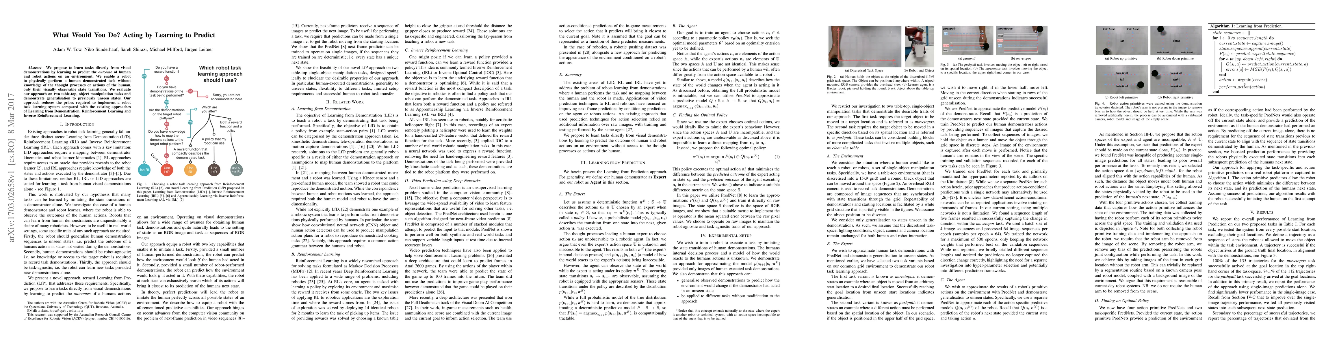 We propose to learn tasks directly from visual demonstrations by learning to predict the outcome of human and robot actions on an environment. We enable a robot to physically perform a human demonstrated task without knowledge of the thought processes or actions of the human, only their visually observable state transitions. We evaluate our approach on two table-top, object manipulation tasks and demonstrate generalisation to previously unseen states. Our approach reduces the priors required to implement a robot task learning system compared with the existing approaches of Learning from Demonstration, Reinforcement Learning and Inverse Reinforcement Learning.